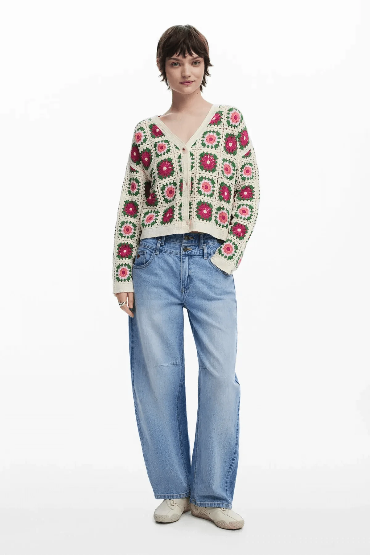 Ce cardigan en crochet fait main séduit par son motif floral coloré et son allure vintage. Son col en V et sa fermeture boutonnée apportent une touche de féminité et de douceur. Idéal pour une superposition bohème et tendance.