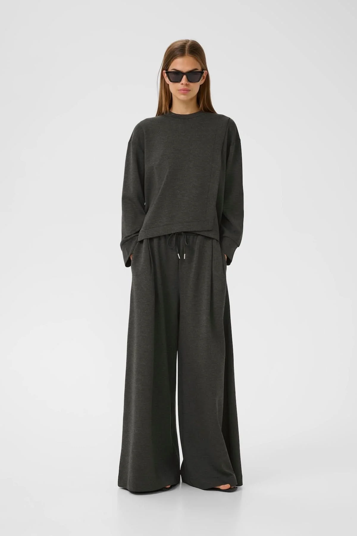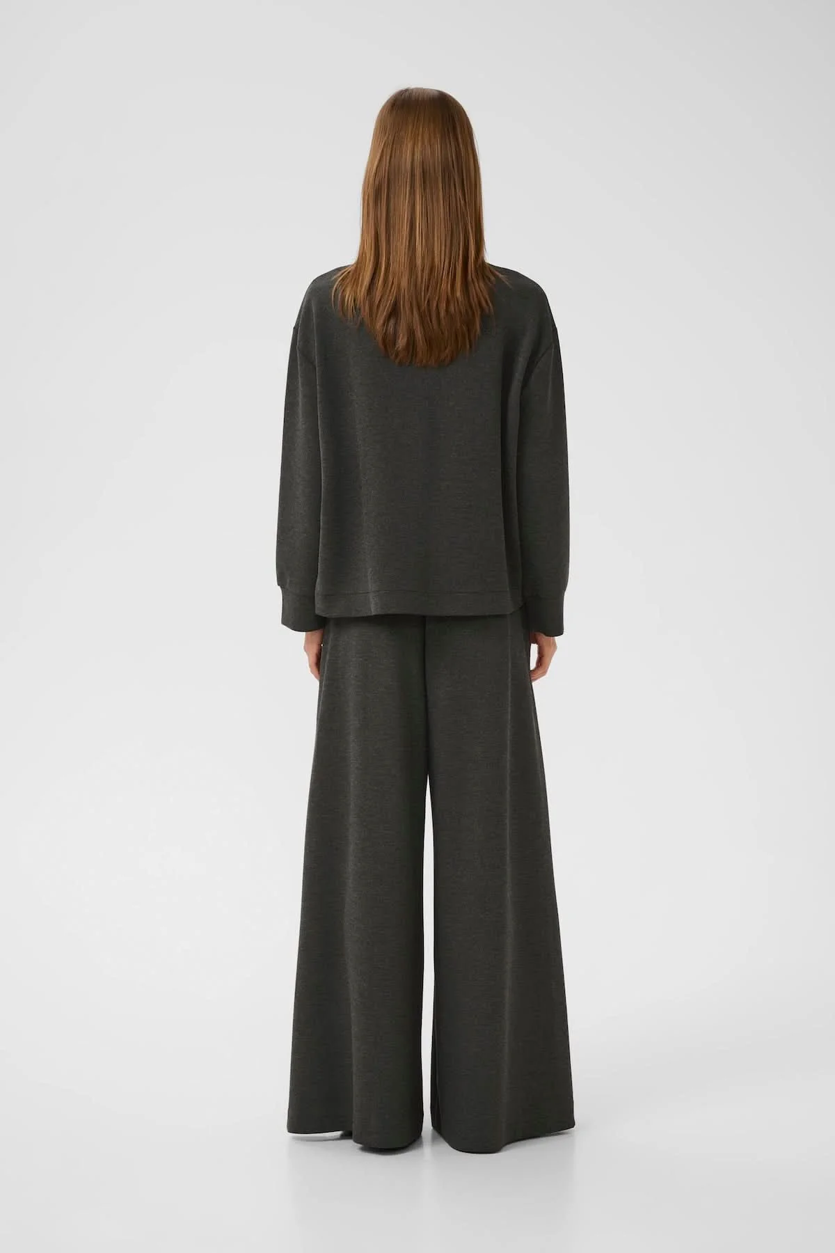 Description: Ce chandail minimaliste séduit par sa coupe contemporaine et ses finitions sobres. Sa matière douce légèrement extensible garantit un confort absolu, tandis que la surpiqûre asymétrique à l’avant ajoute une touche architecturale. Un essentiel moderne pour les tenues de détente ou les looks urbains. Conseil style : à associer à son pantalon coordonné ou à un jean brut pour une allure épurée.