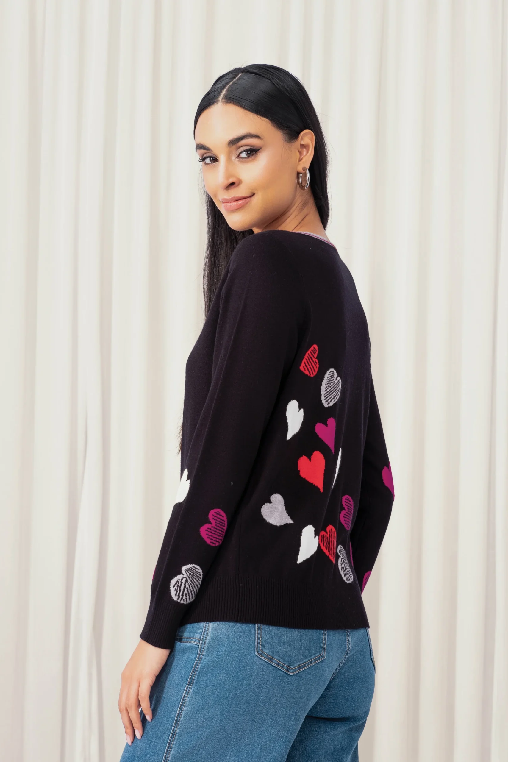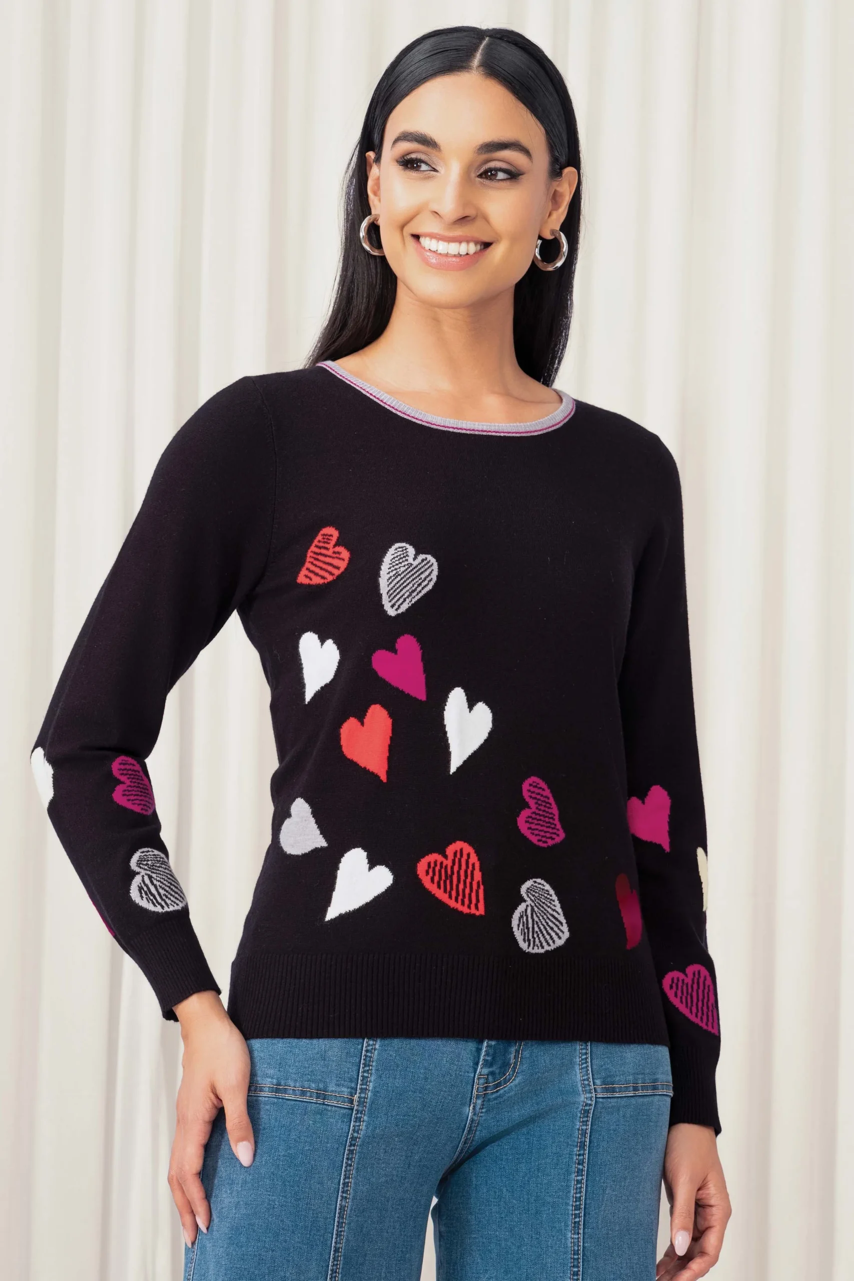 Description : Ce chandail à motifs de cœurs colorés insuffle une touche ludique et féminine à votre garde-robe. Sa coupe ajustée et son tricot doux en font un allié parfait pour la mi-saison. Conseil style : portez-le avec un jean droit ou une jupe en denim pour un look décontracté et charmant.