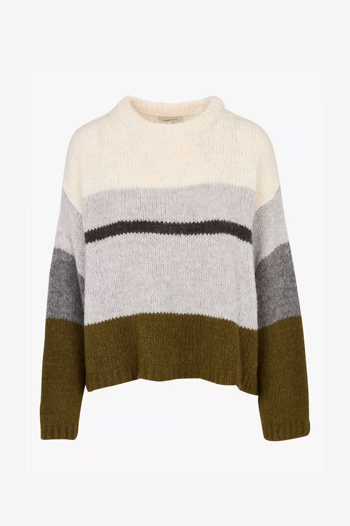 Description: Ce chandail à rayures color block allie confort et modernité. Sa maille épaisse et sa coupe légèrement ample en font une pièce idéale pour les journées fraîches. Conseil style : portez-le avec un jean taille haute et des bottines pour un look décontracté et tendance.