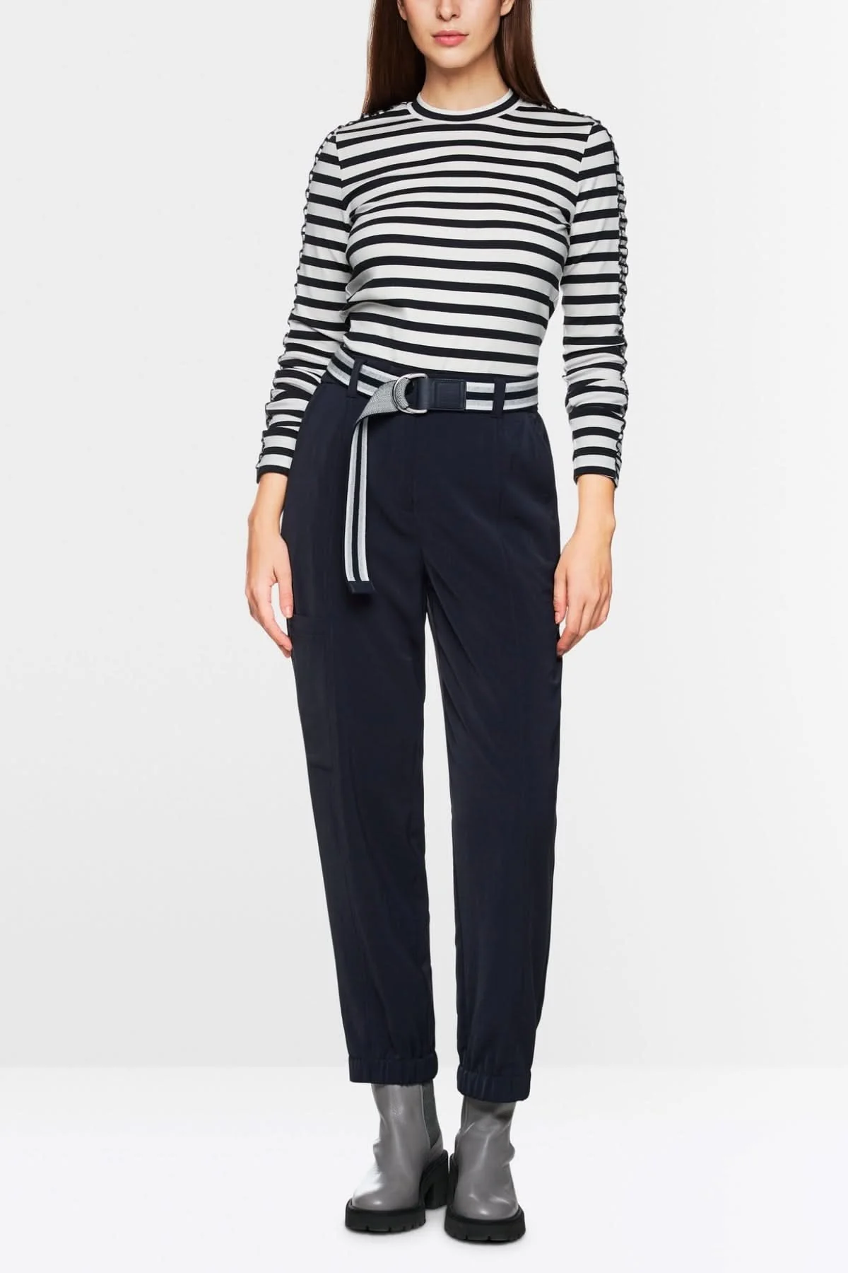 Description: Ce chandail rayé offre une interprétation moderne du style marin, rehaussée par des détails féminins distinctifs. Sa coupe étroite épouse la silhouette, tandis que les mini-volants délicats sur les manches ajoutent une touche de fantaisie. Confectionné dans un jersey de coton stretch, il assure un confort optimal du matin au soir. Détails: Motif rayé […]