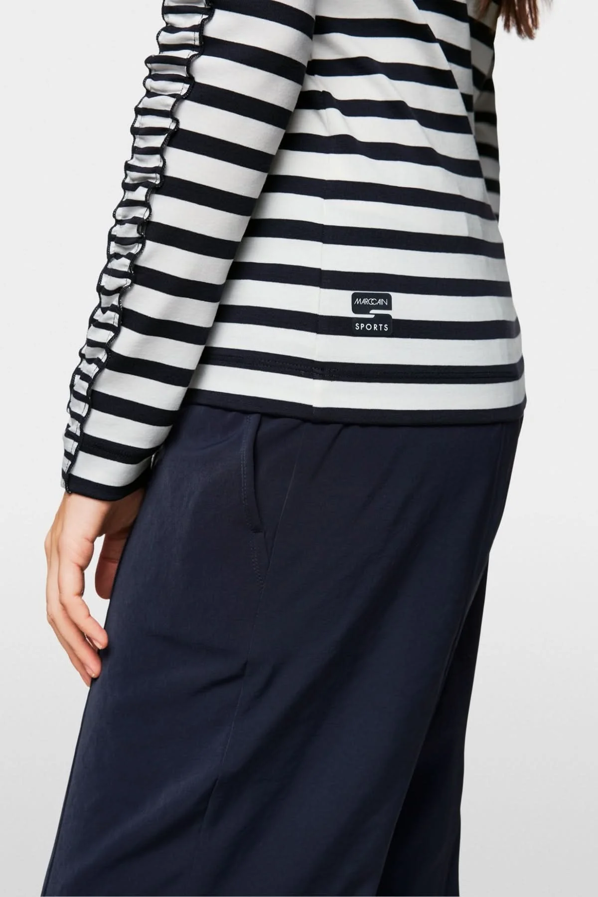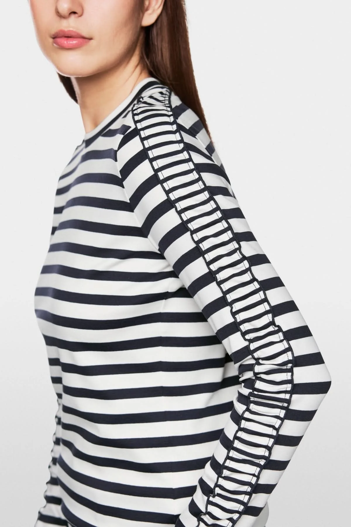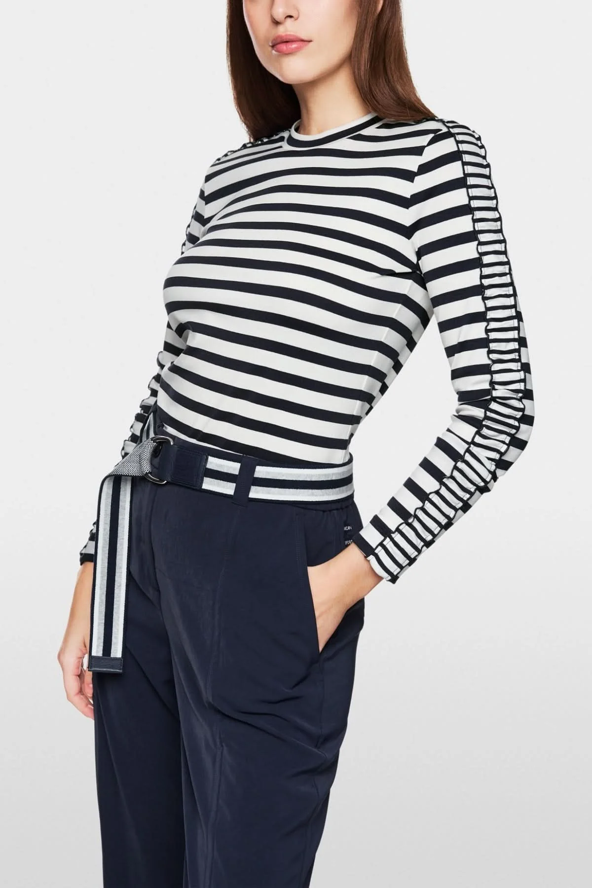 Description: Ce chandail rayé offre une interprétation moderne du style marin, rehaussée par des détails féminins distinctifs. Sa coupe étroite épouse la silhouette, tandis que les mini-volants délicats sur les manches ajoutent une touche de fantaisie. Confectionné dans un jersey de coton stretch, il assure un confort optimal du matin au soir.