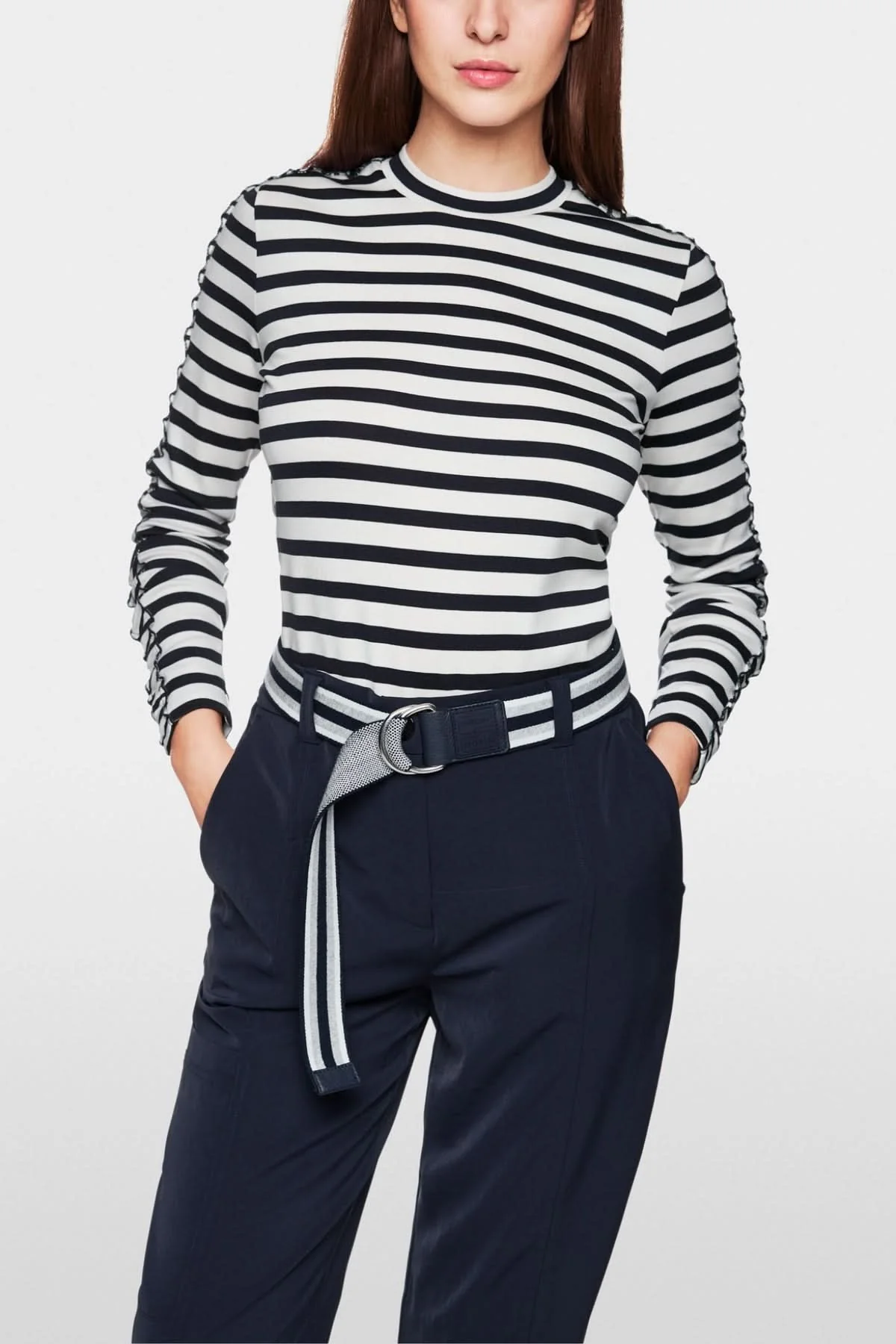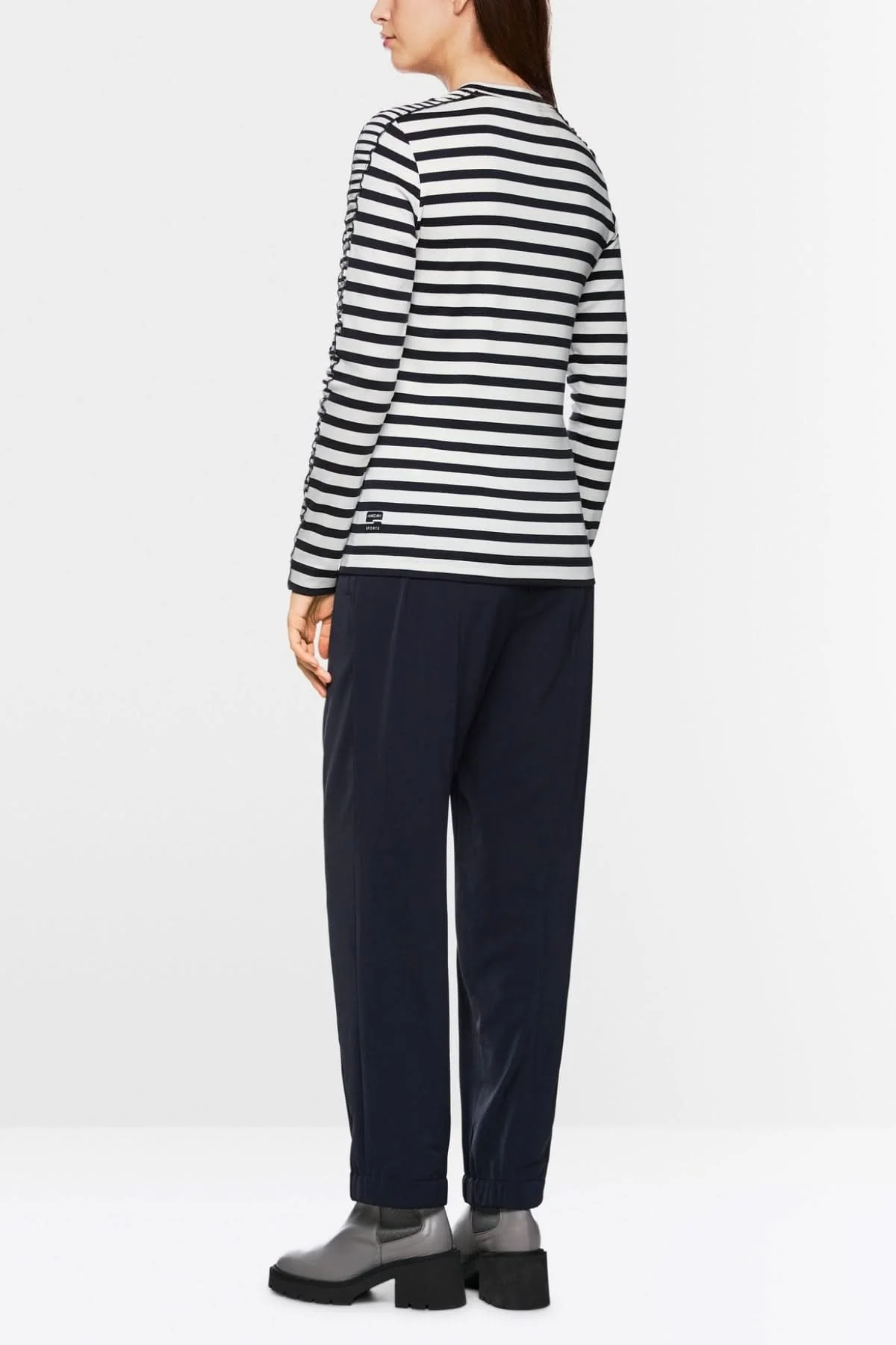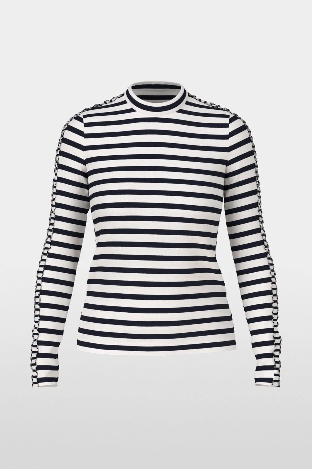 Description: Ce chandail rayé offre une interprétation moderne du style marin, rehaussée par des détails féminins distinctifs. Sa coupe étroite épouse la silhouette, tandis que les mini-volants délicats sur les manches ajoutent une touche de fantaisie. Confectionné dans un jersey de coton stretch, il assure un confort optimal du matin au soir.