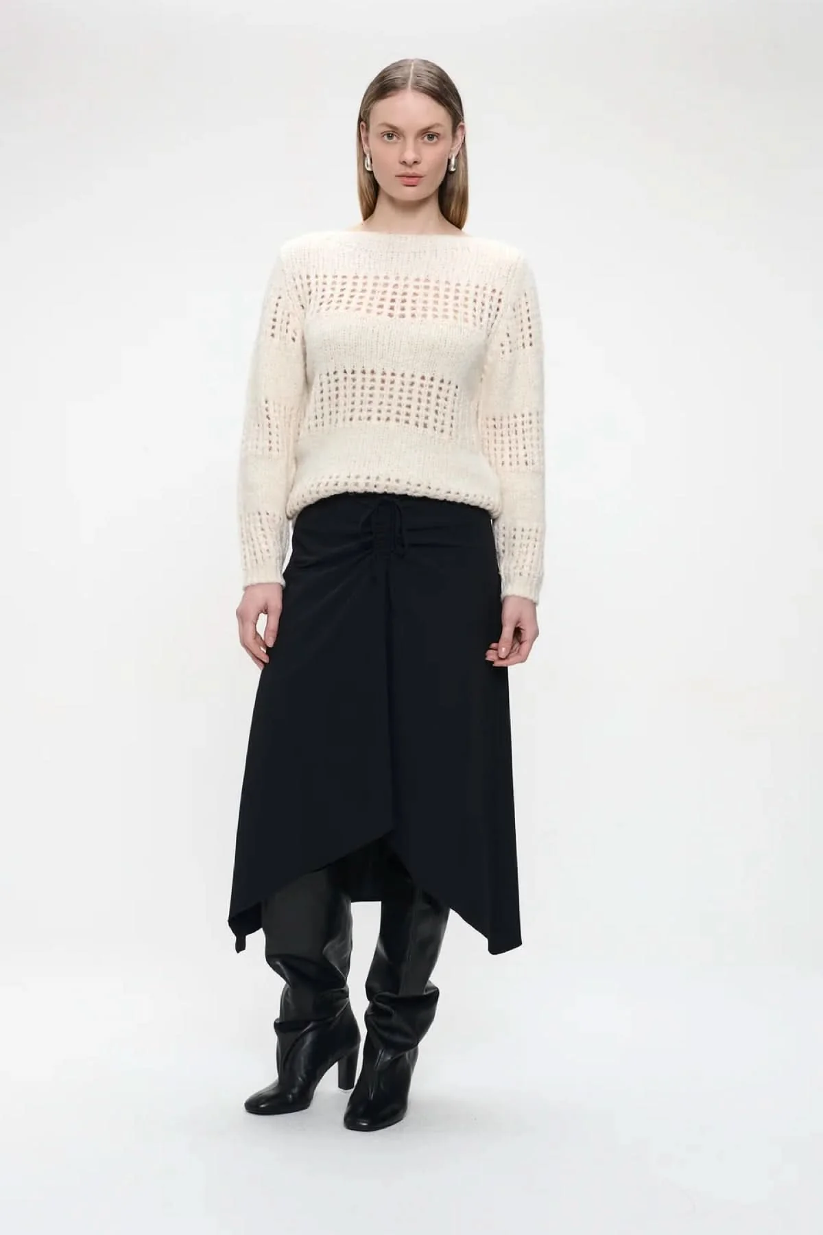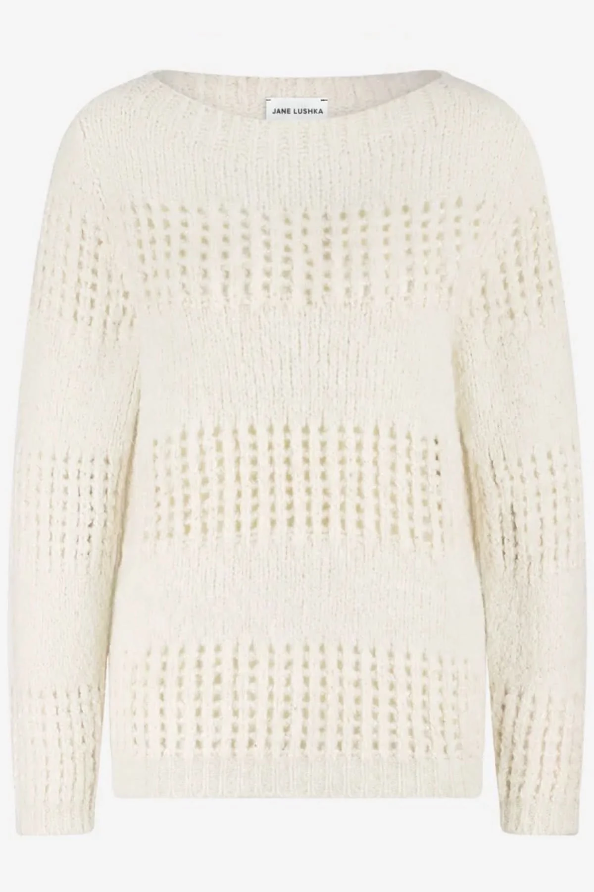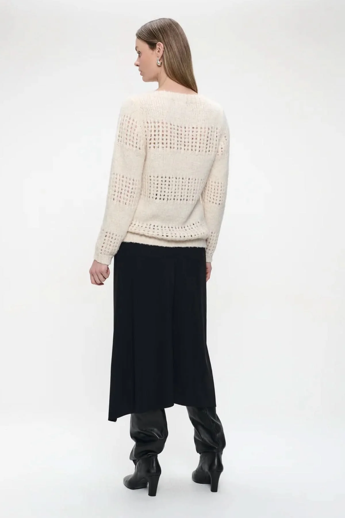 Description: Ce chandail ajouré à encolure ronde combine légèreté et allure moderne. Sa maille transparente apporte une touche sophistiquée, idéale pour jouer avec les superpositions. Conseil style : portez-le sur un caraco ou glissez-le dans une jupe taille haute pour un look chic et raffiné.