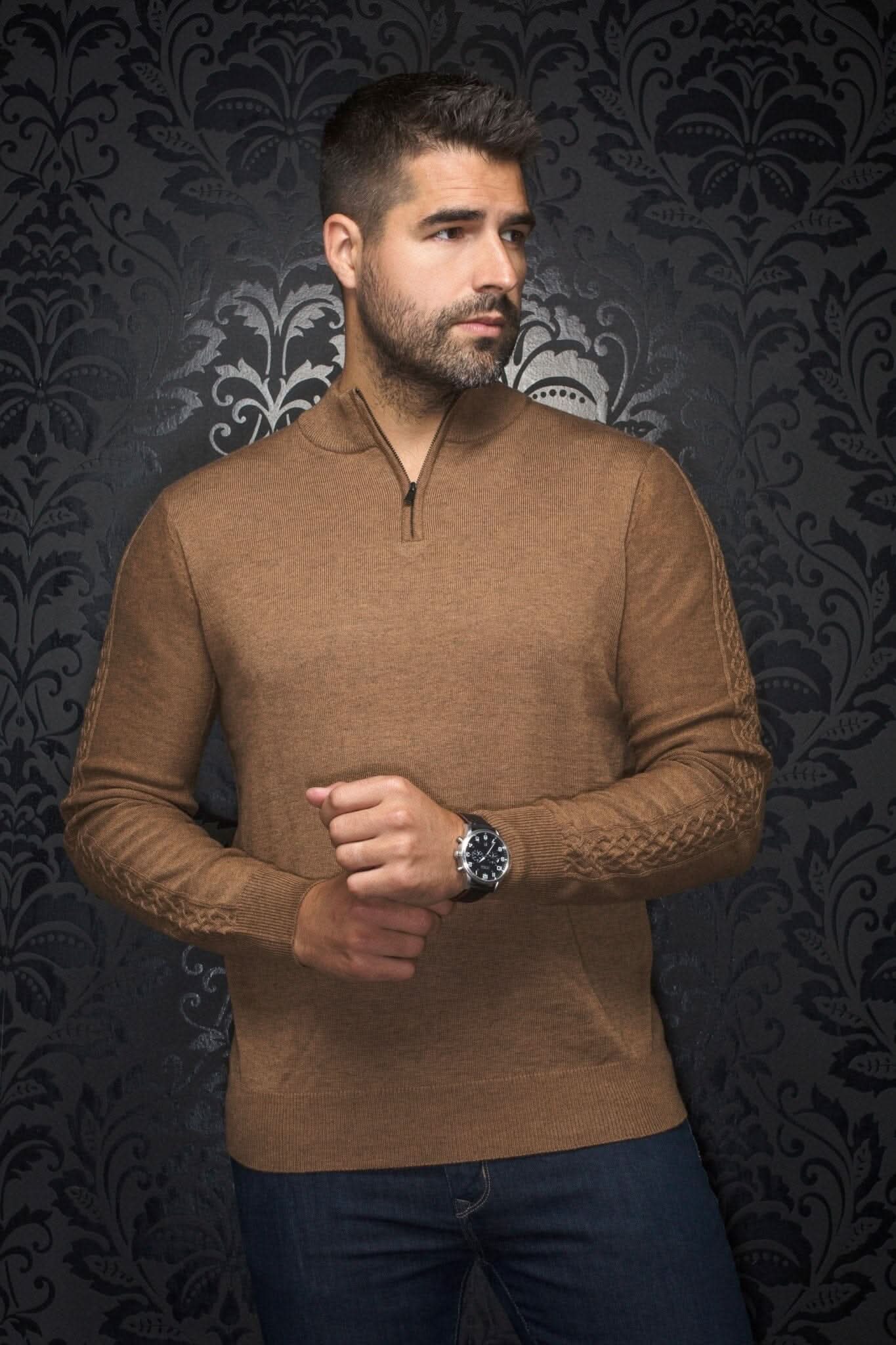 Chandail col avec zip en mérinos Mesta tan