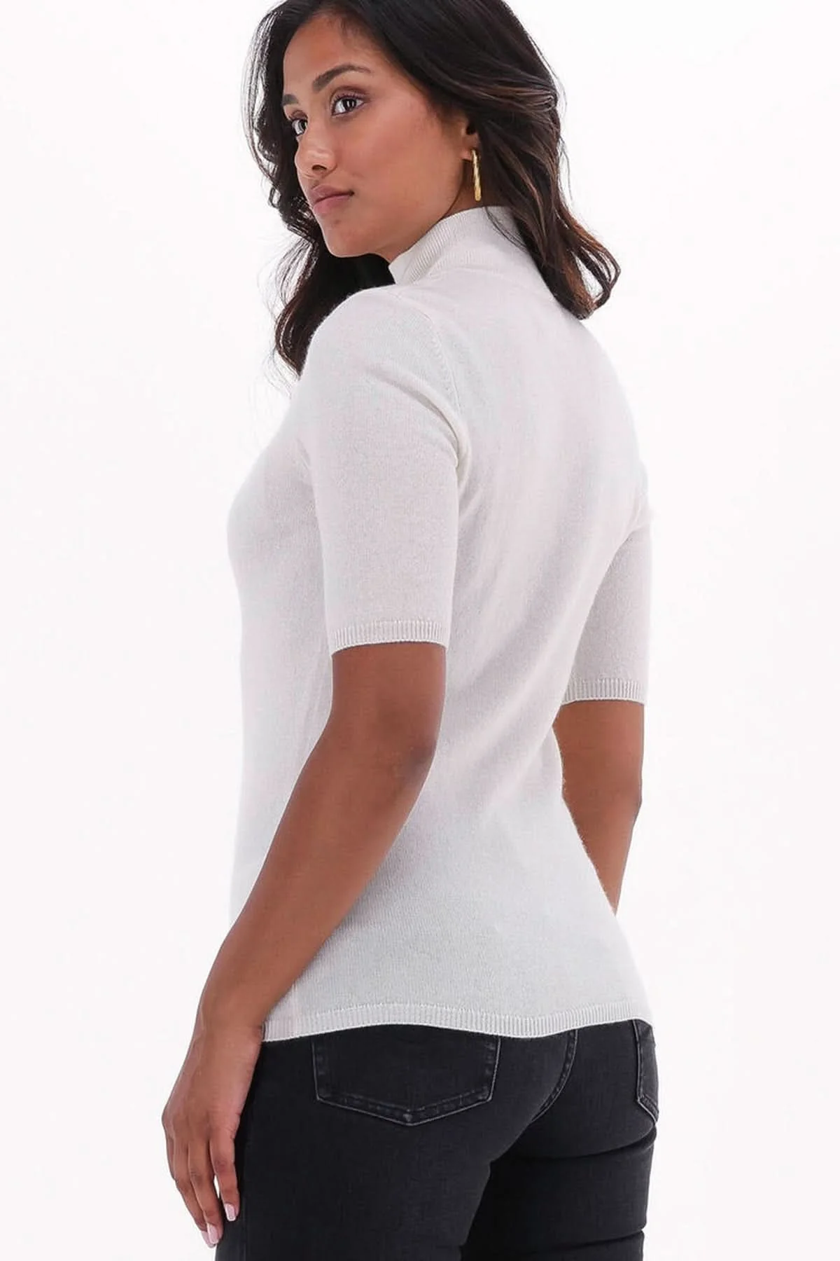 Description: Ce chandail à manches courtes et col montant combine simplicité et élégance moderne. Sa maille fine épouse délicatement la silhouette pour un style polyvalent. Conseil style : porte-le avec un jean foncé ou sous un blazer pour un look soigné et intemporel.