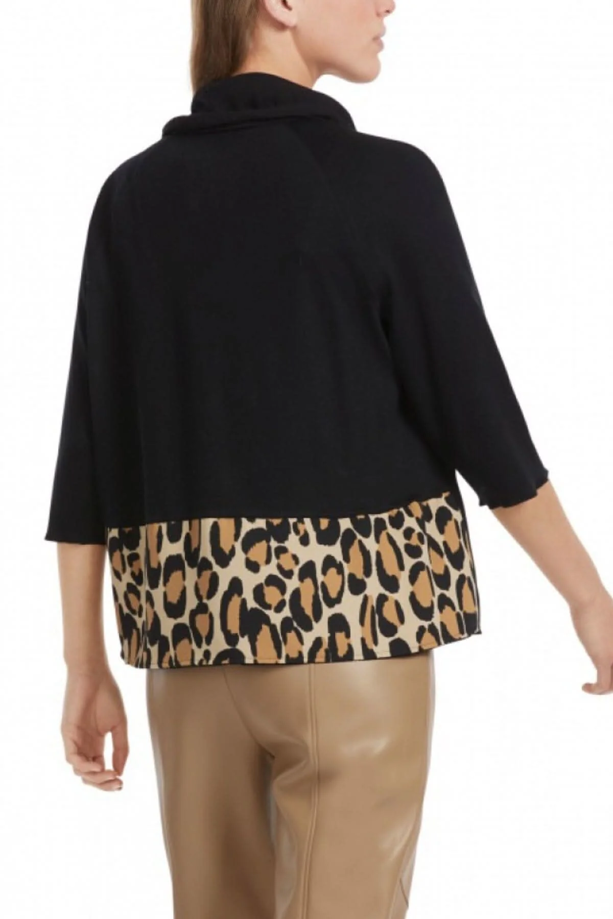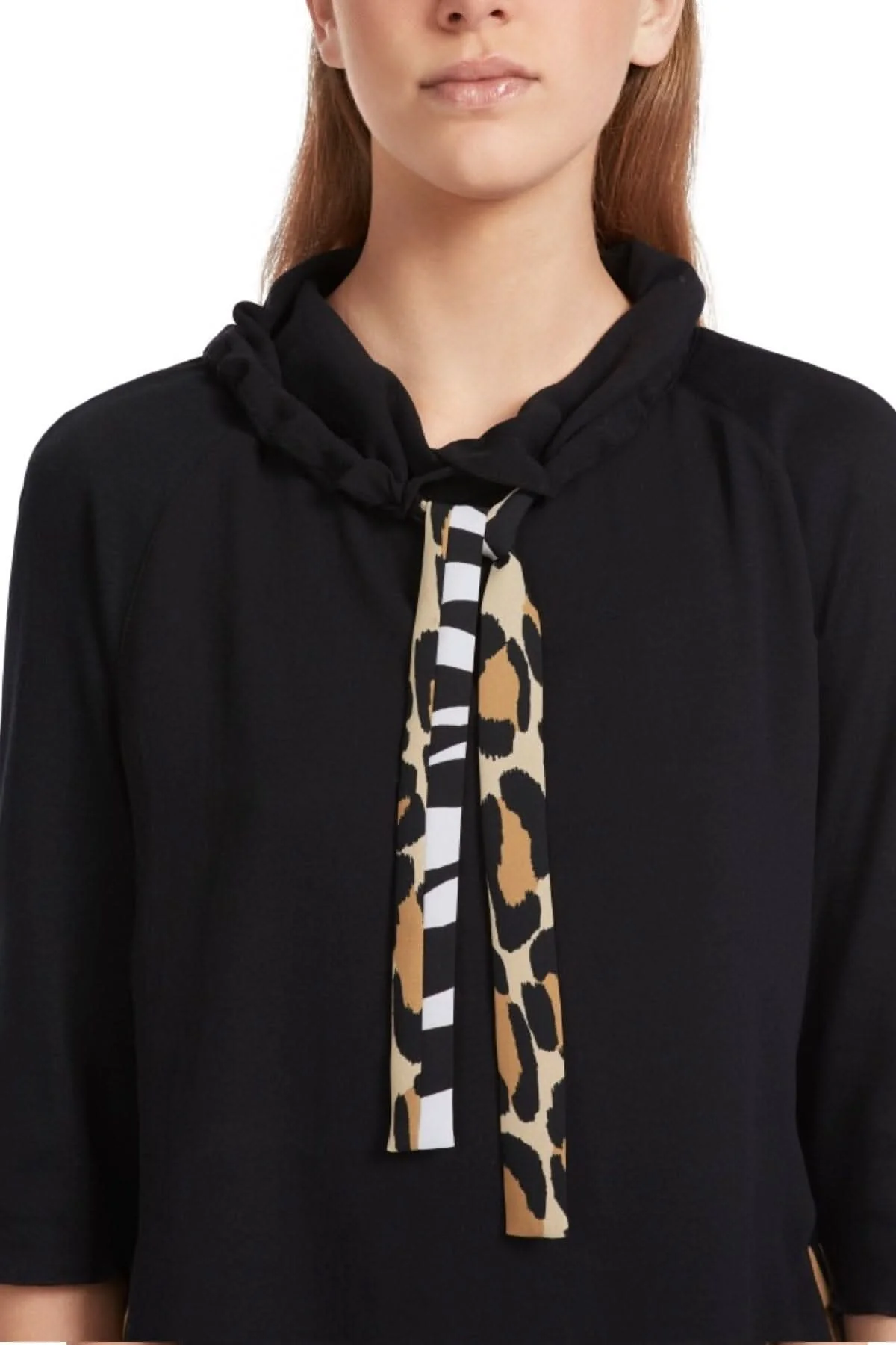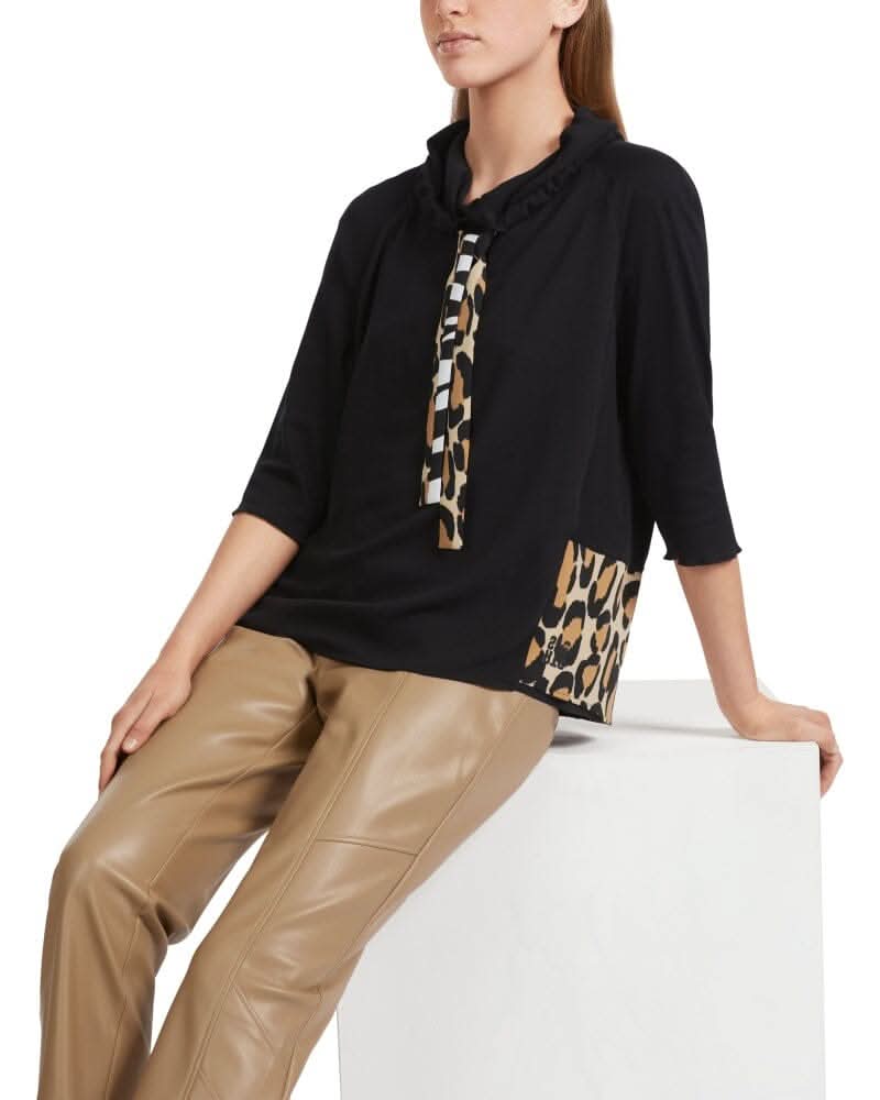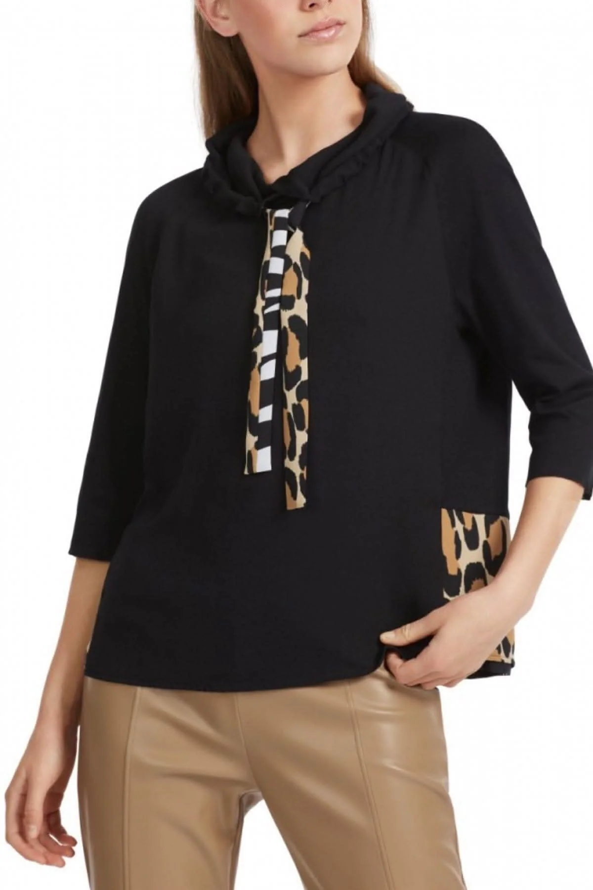 Description : La manche raglan et le col large rendent la blouse facile à porter. La blouse peut être ajusté avec le cordon de serrage, le mélange de matière crée un contraste passionnant, les manches et le côté du devant sont en jersey côtelé doux et forment un contraste animalier avec le tissu, sa coupe est ample et décontractée