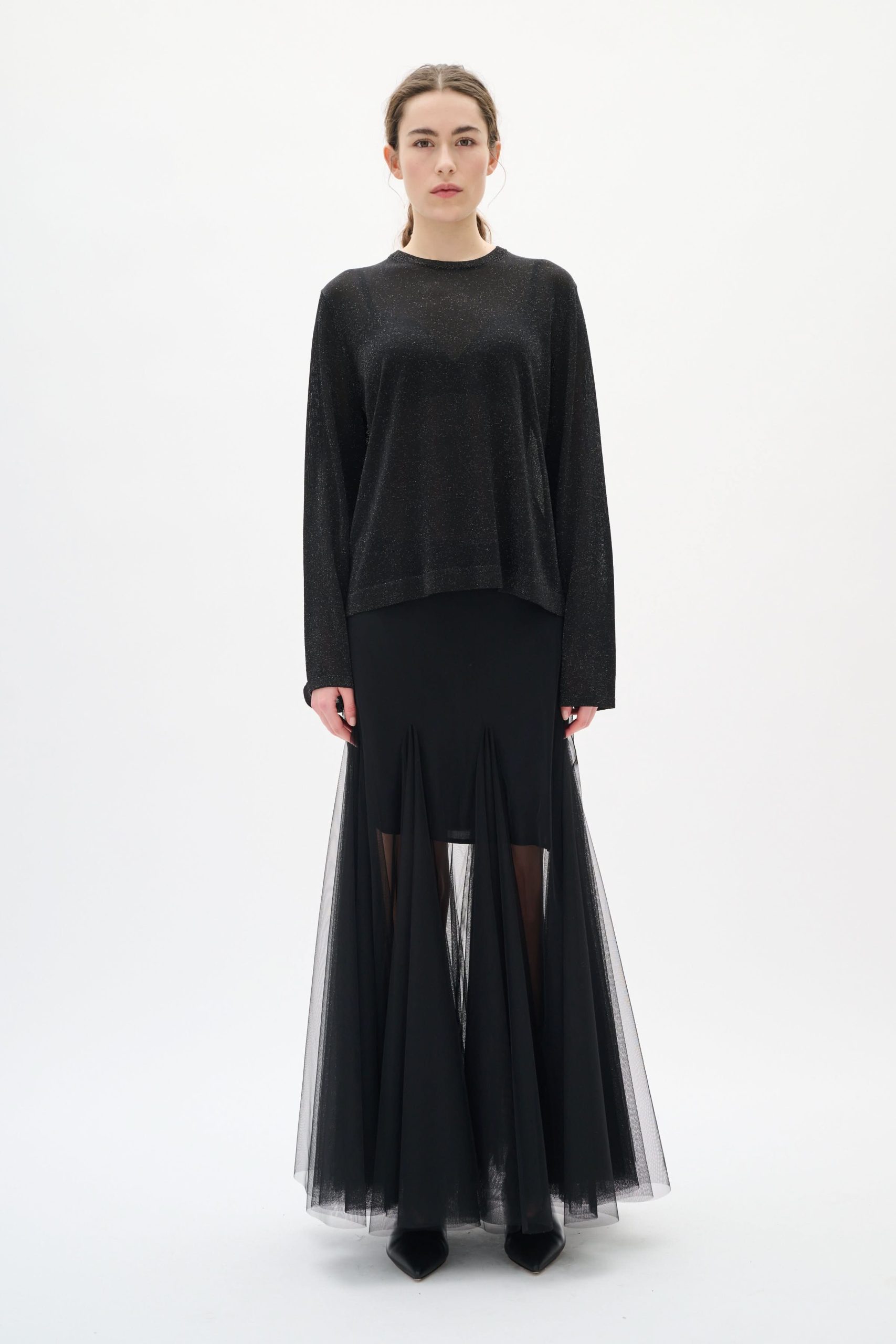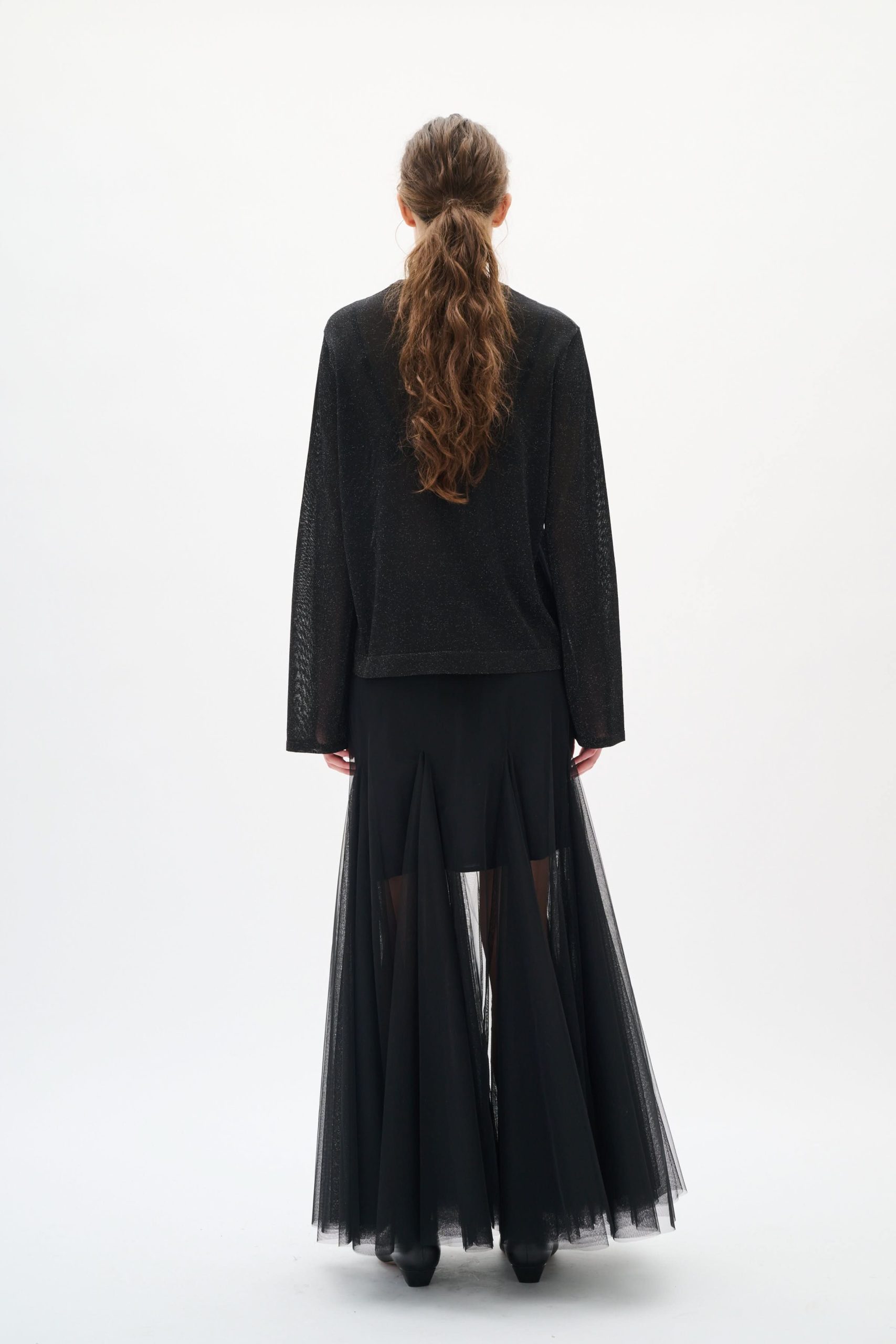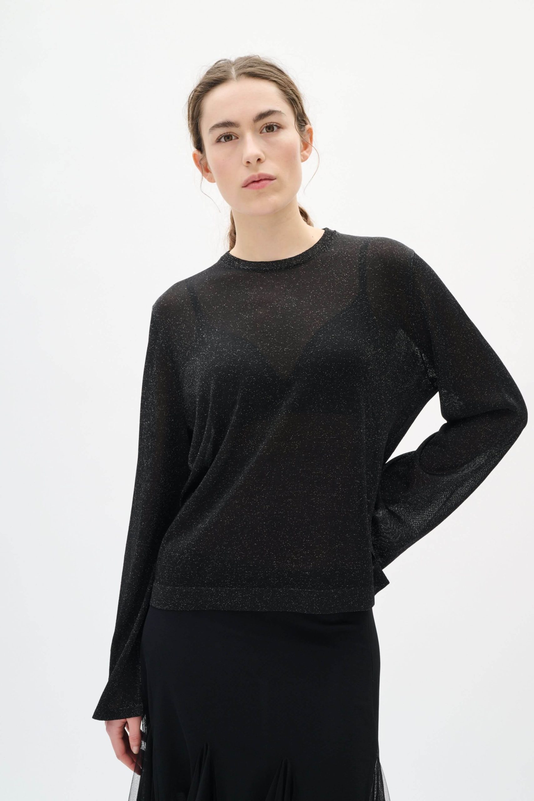 Description : Ce chandail léger et scintillant apporte une touche d’élégance discrète à vos tenues. Sa matière légèrement transparente et son fini lumineux créent un effet raffiné parfait pour les soirées ou les occasions spéciales. Avec sa coupe fluide et ses manches longues, il allie confort et modernité.
