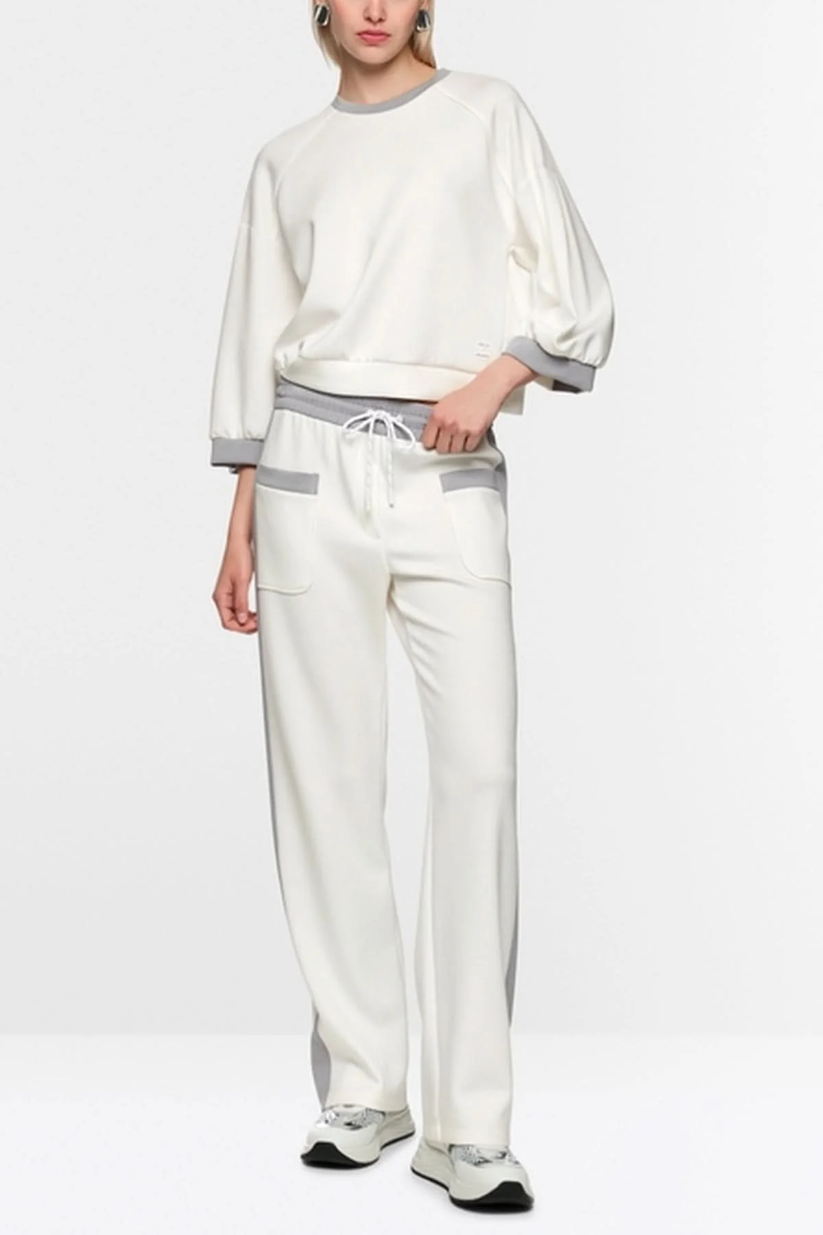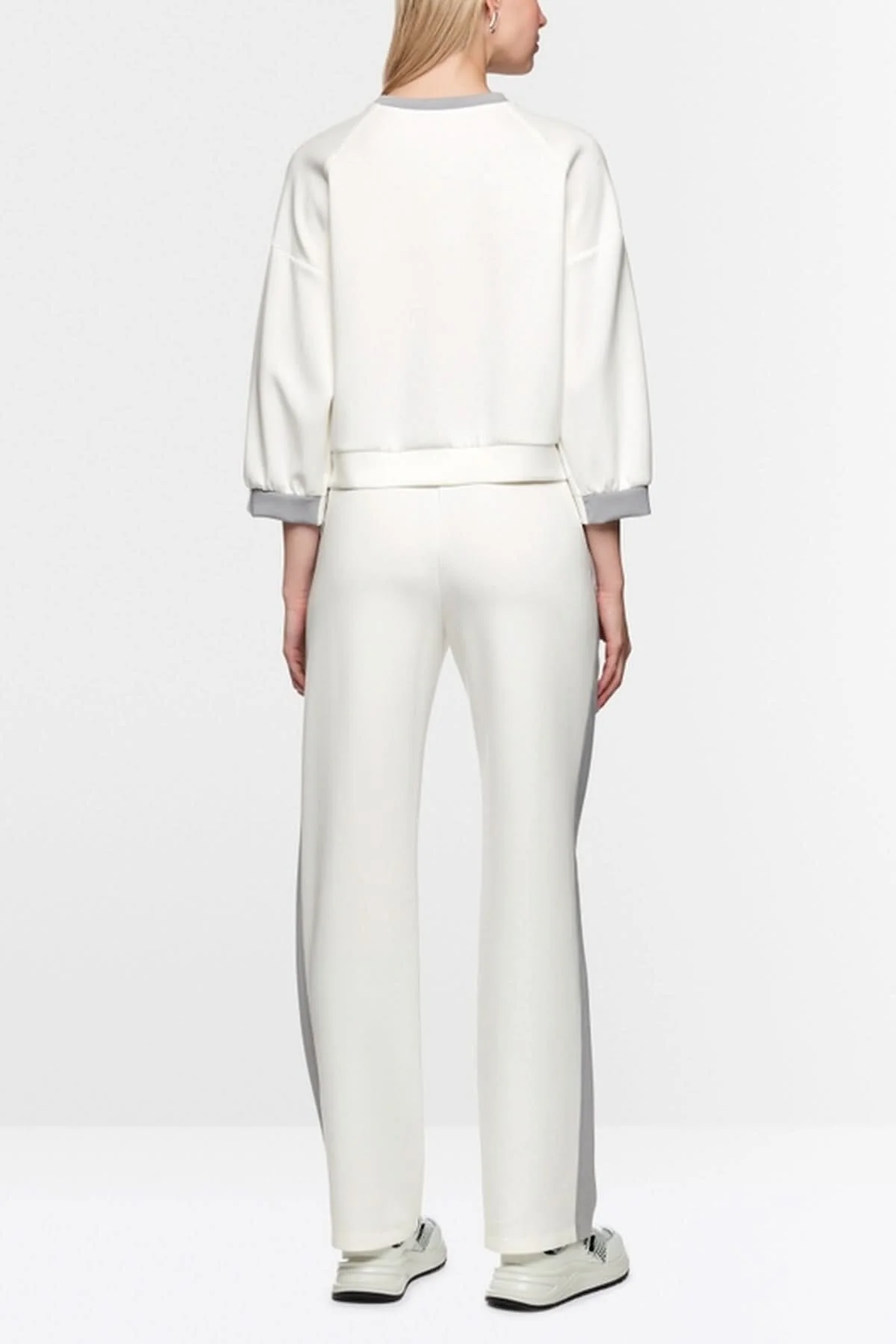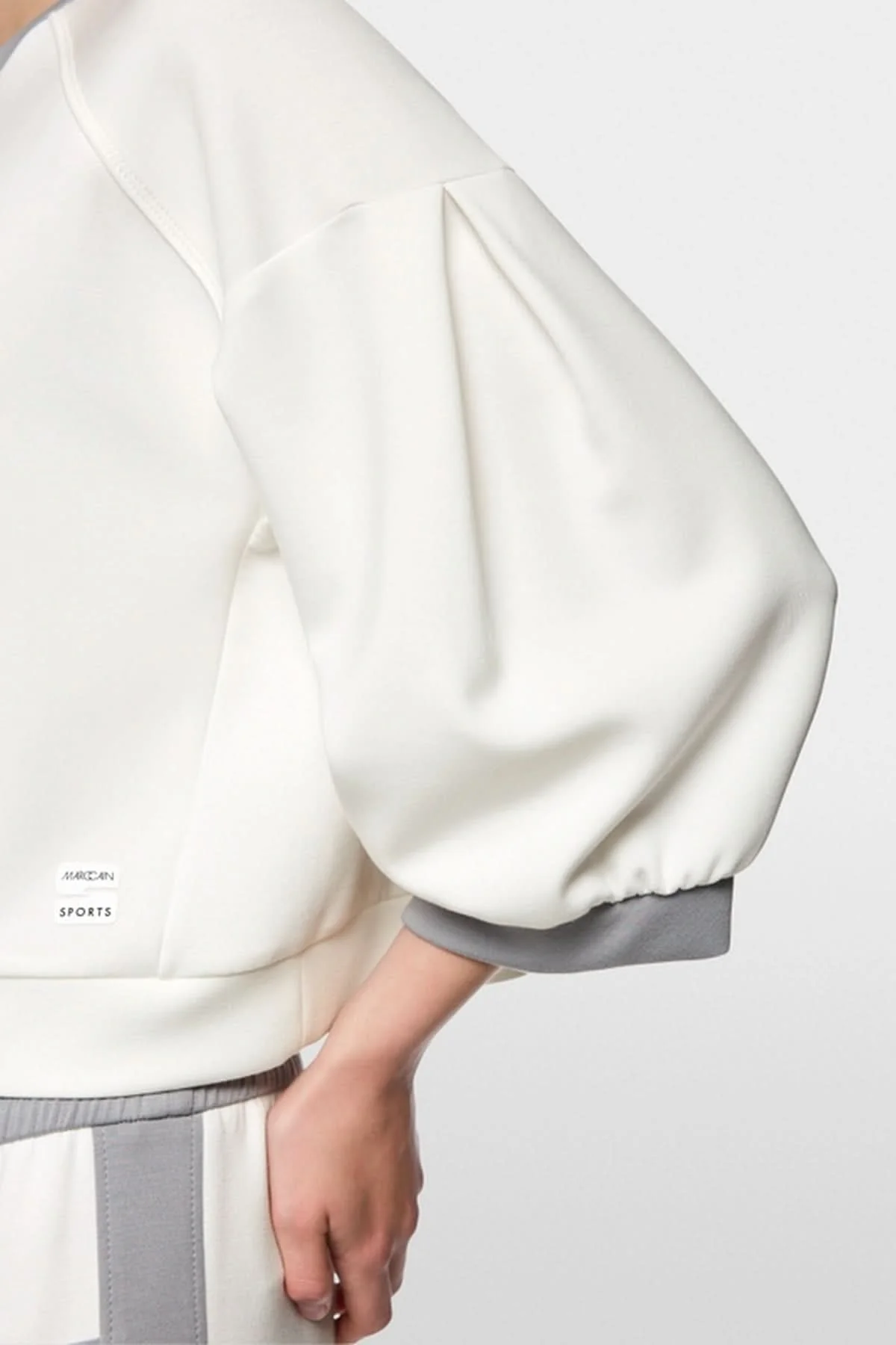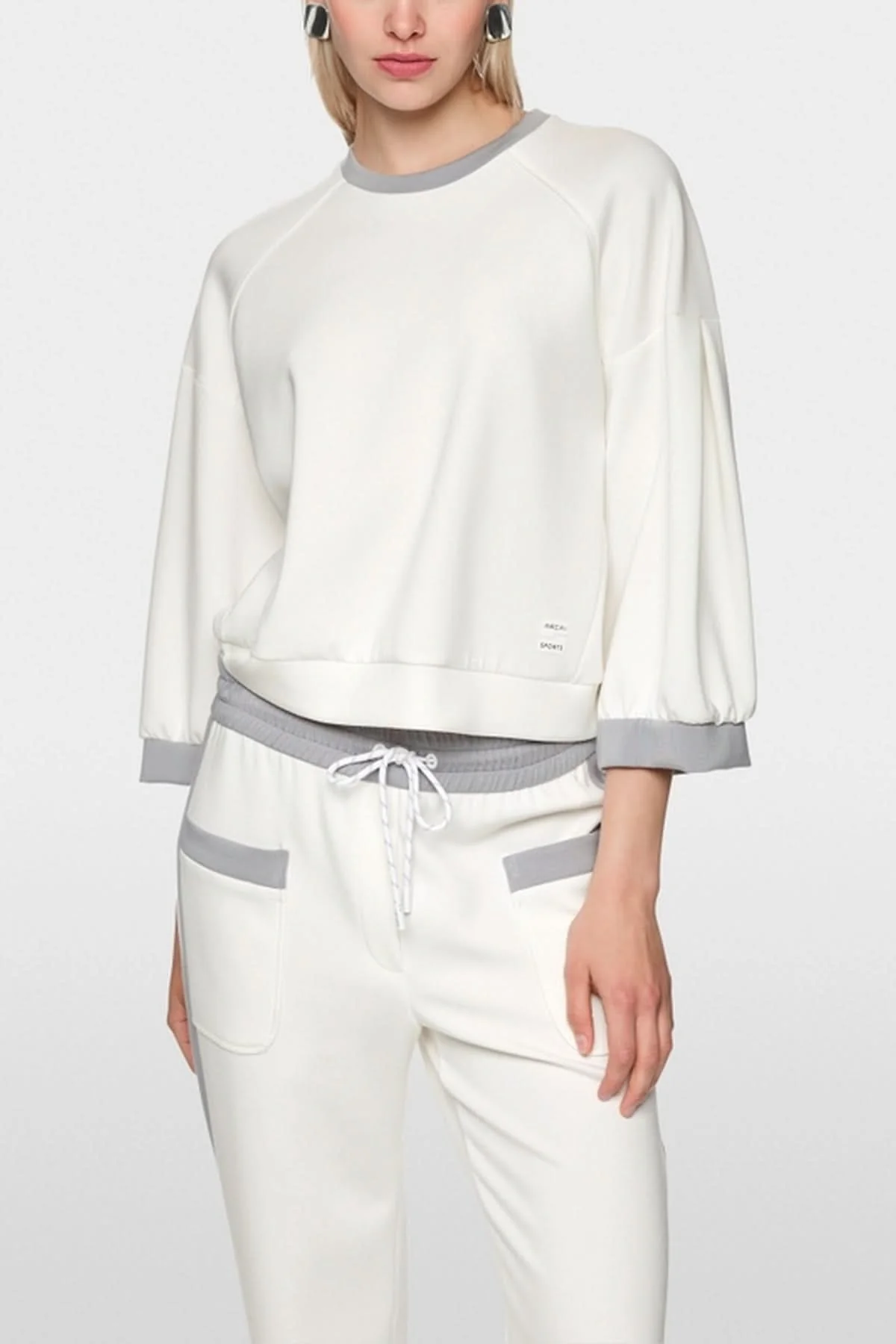 Description : Ce coton ouaté séduit par son mélange de matières ultra-douces, agréables au toucher. Le haut présente une coupe ample et des manches larges, légèrement raccourcies pour une longueur 3/4 décontractée. La coupe carrée et les plis donnent aux manches un aspect bouffant. Les épaules sont tombantes et le coton ouaté est orné de coutures contrastées ainsi que du logo Marc Cain Sports. Le compagnon idéal pour les journées de détente.
