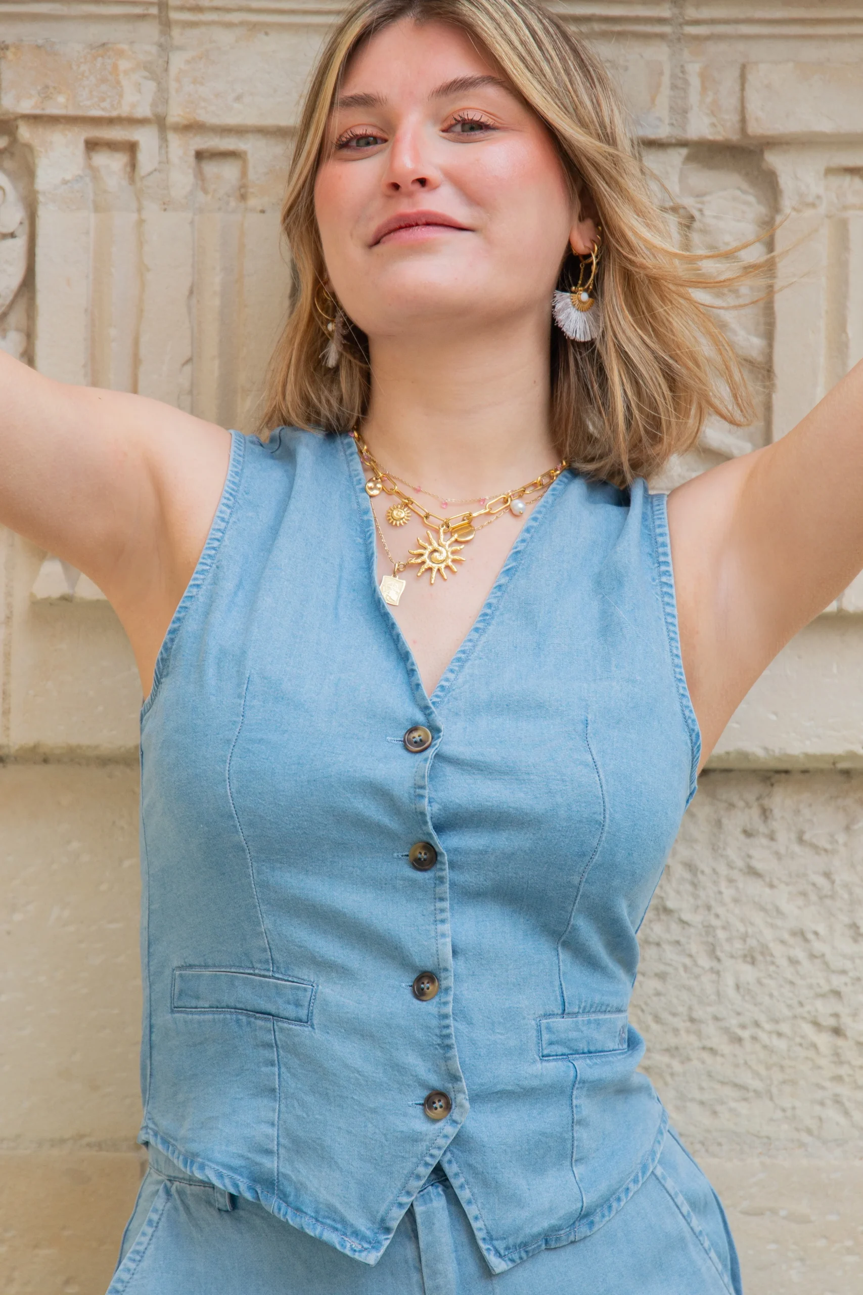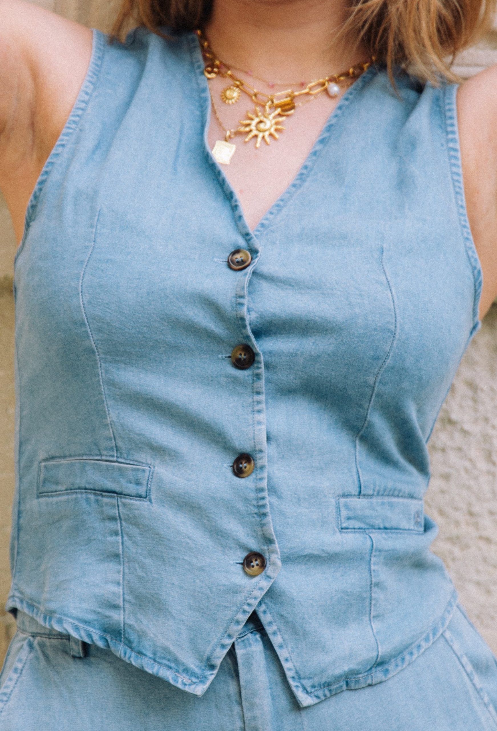 Ce gilet sans manche se marie parfaitement avec notre pantalon PERLINE.