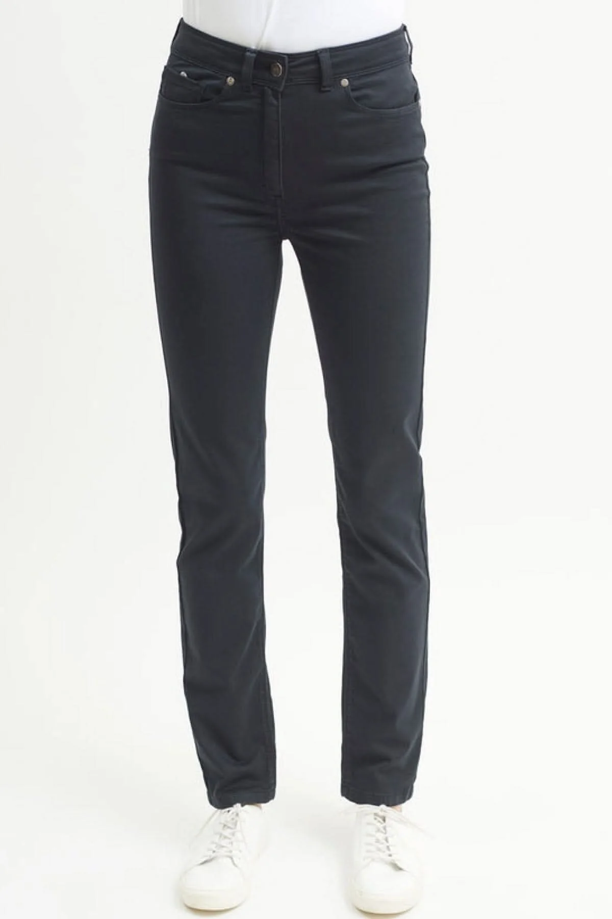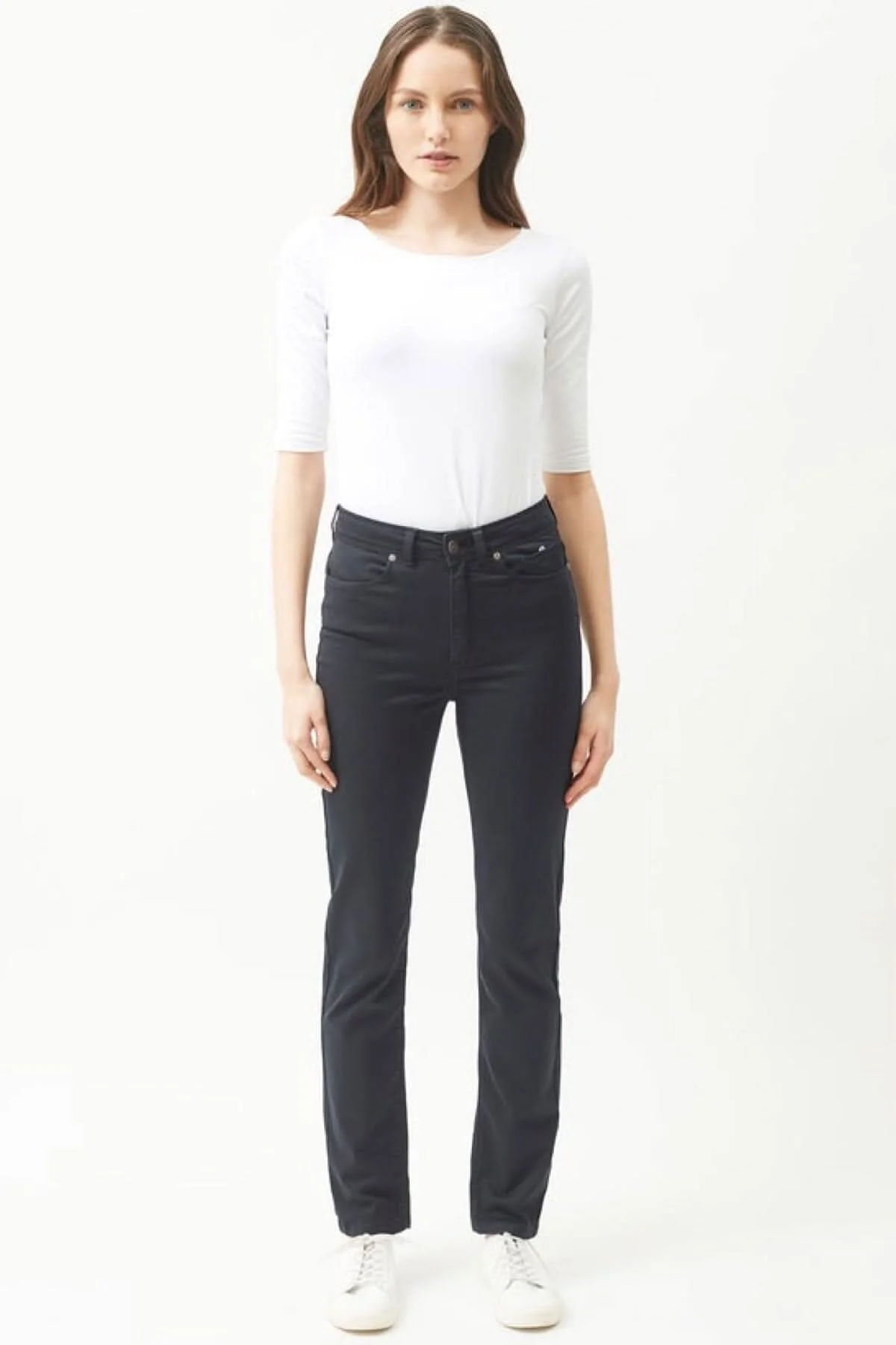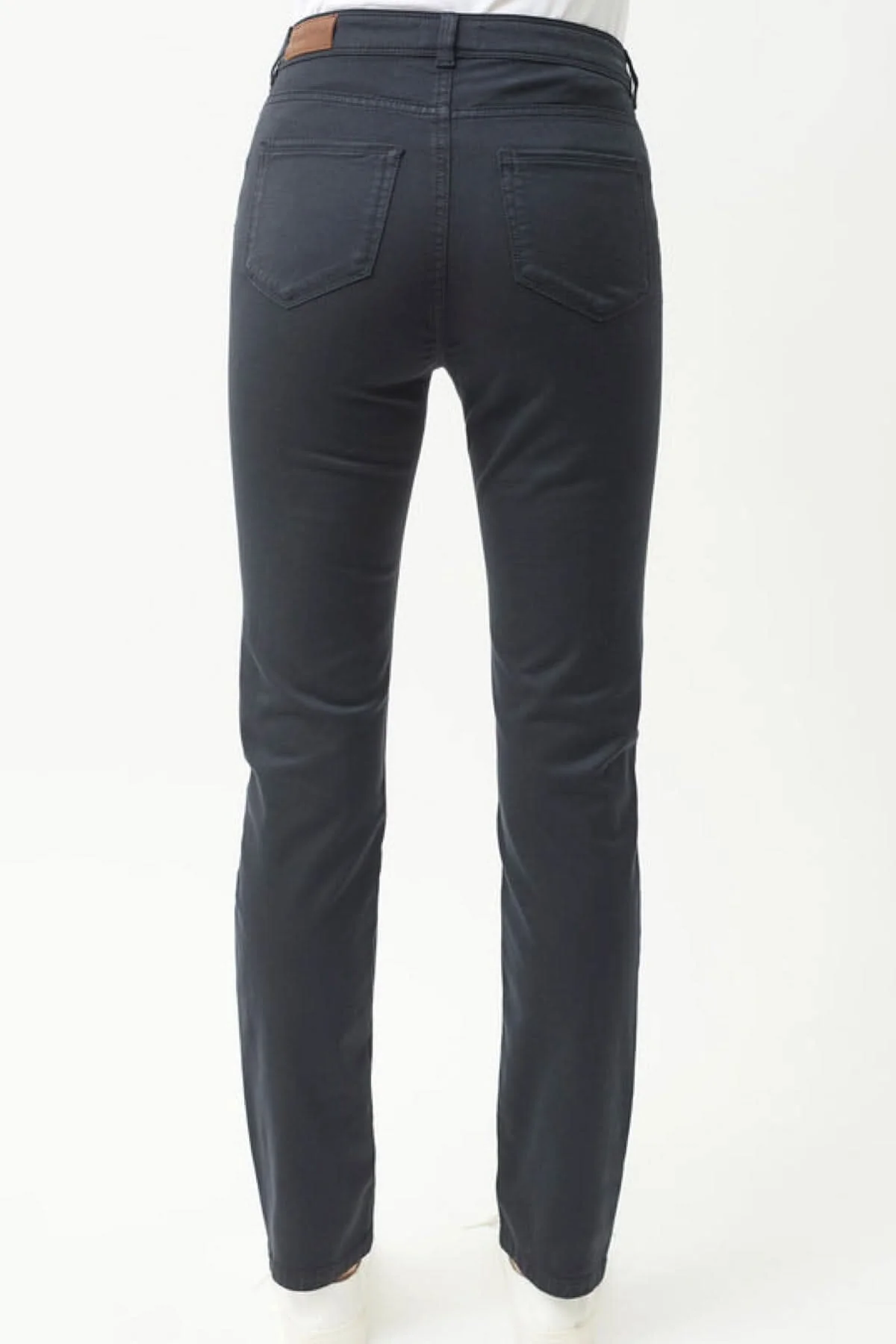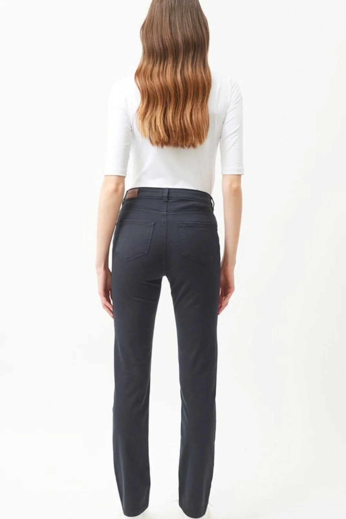 MIMOSA COULEUR le jean tout confort, avec une taille haute qui enveloppe les hanches et une matière extensible, jean 5 poches, poches au dos angulaires, bouton en métal gravé ancre, coupe ajustée