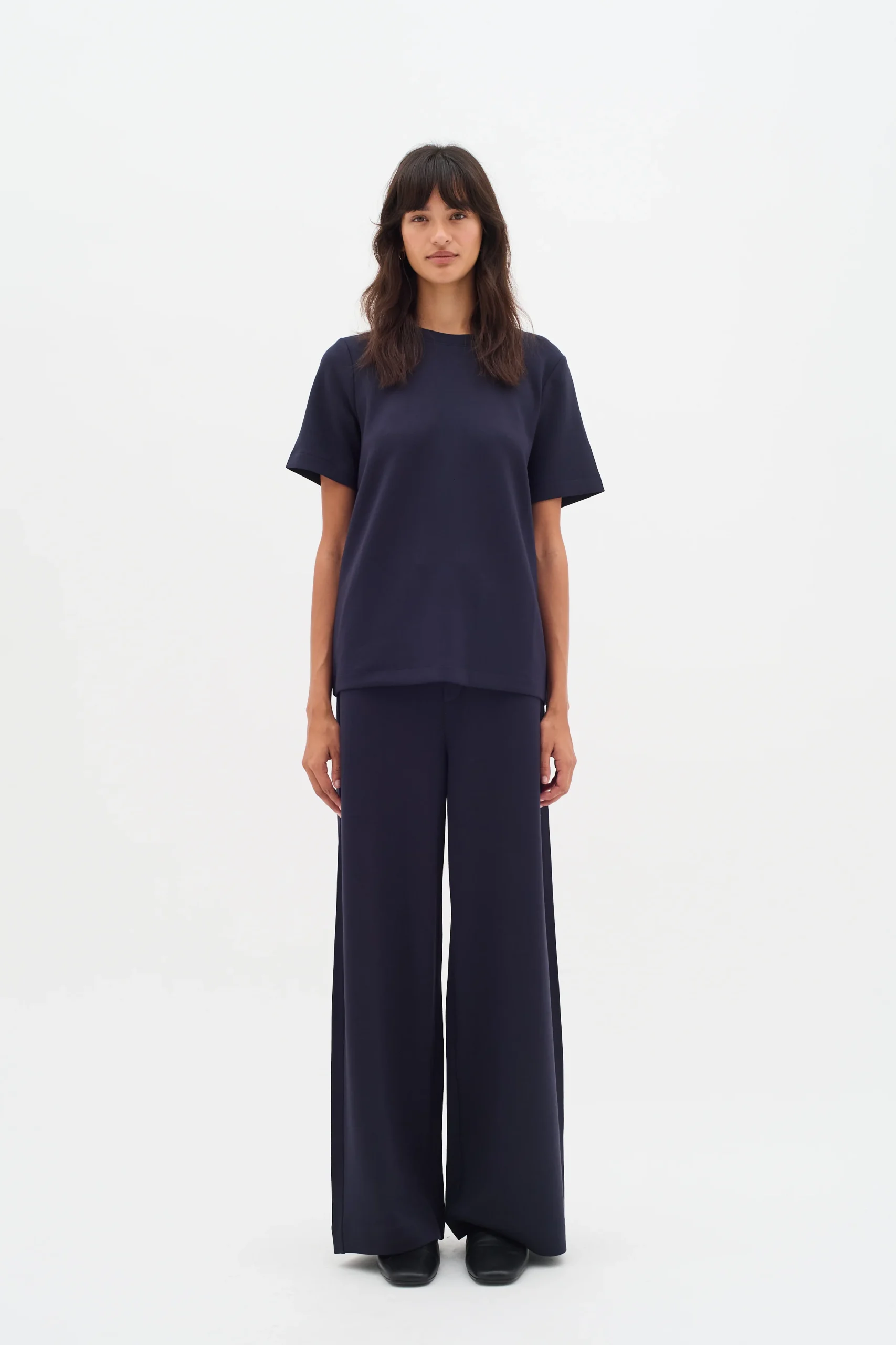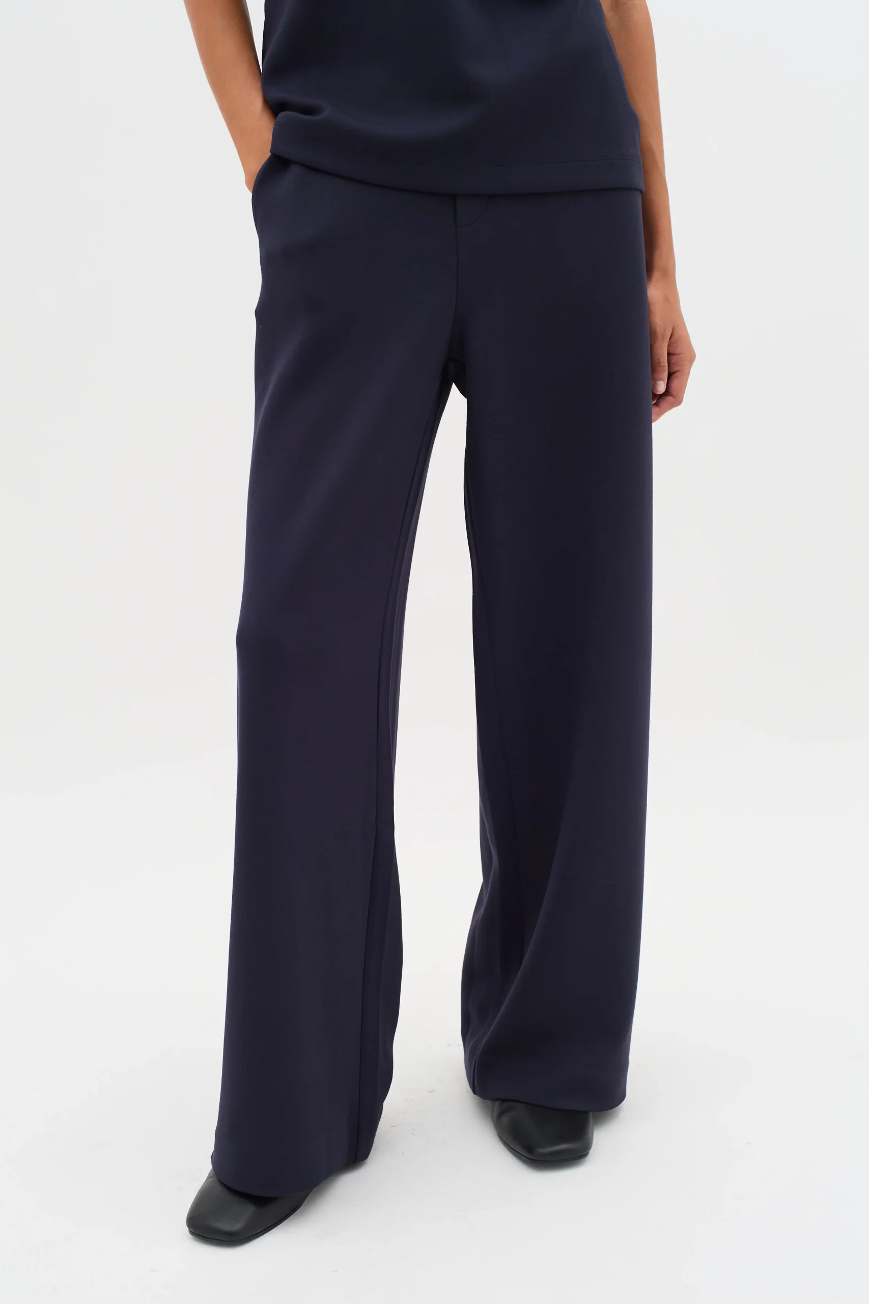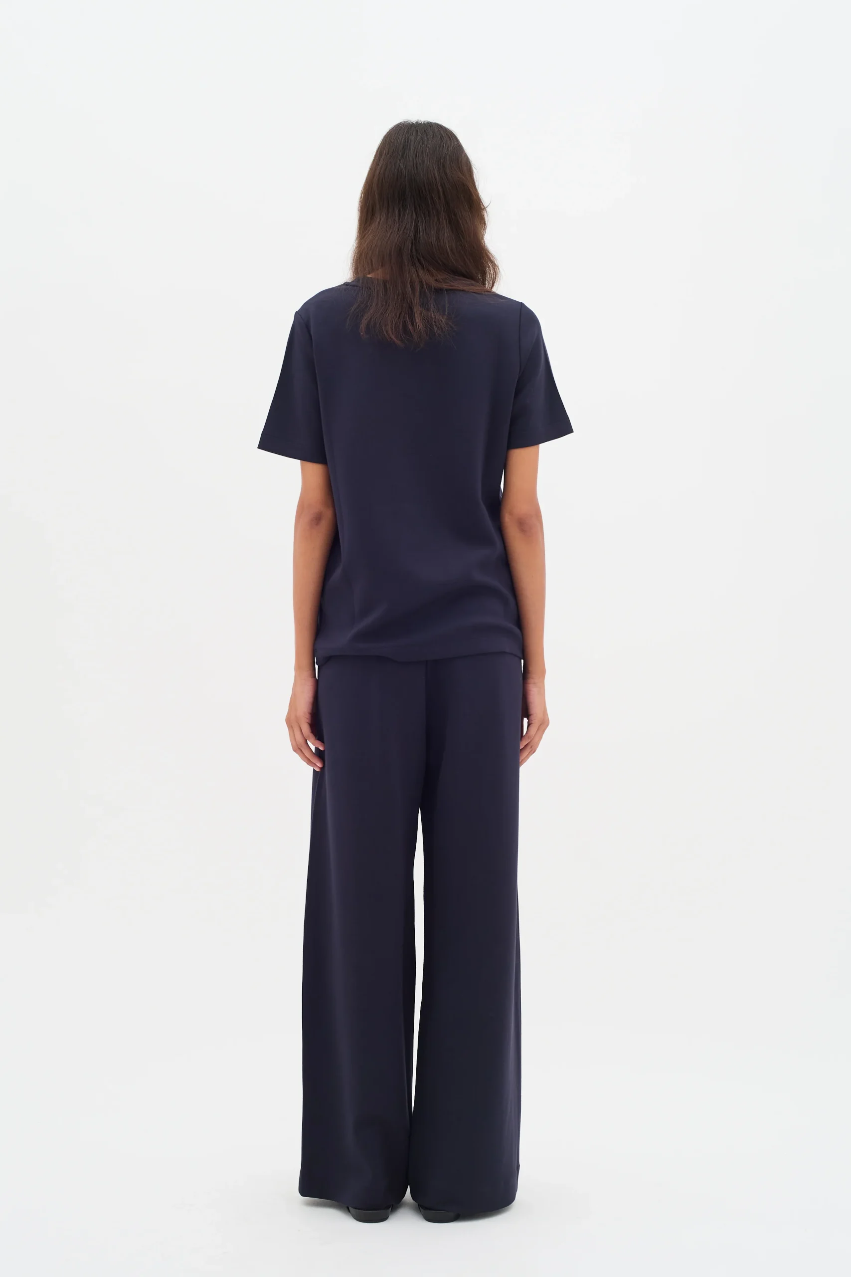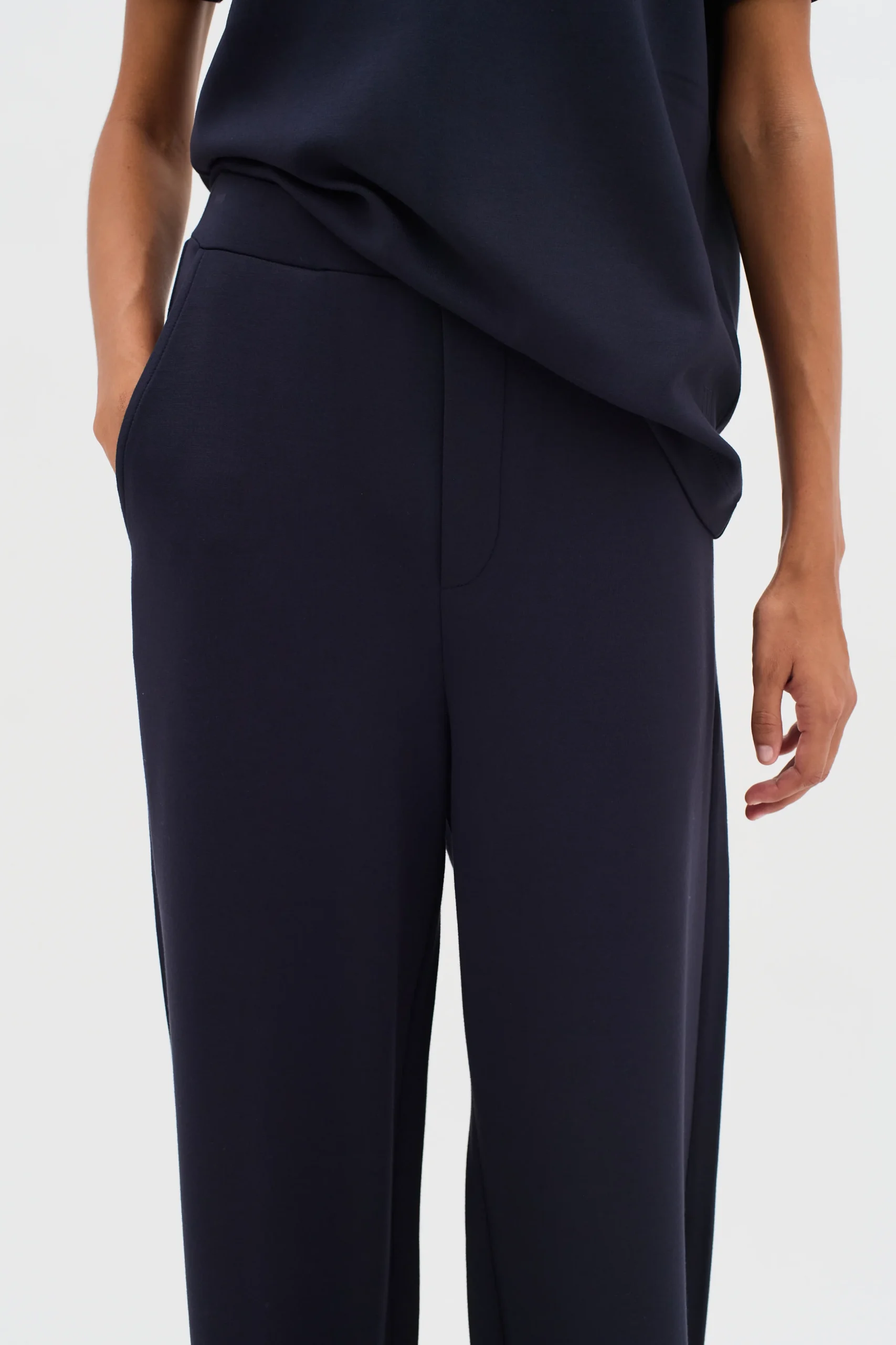 Pantalon à jambe large au style épuré et contemporain, conçu pour offrir une silhouette fluide et élégante. Sa coupe droite ample allonge la ligne de la jambe et assure un confort optimal, idéal autant pour le bureau que pour une tenue plus habillée. Le tissu souple et extensible garantit un tombé net et agréable tout au long de la journée.