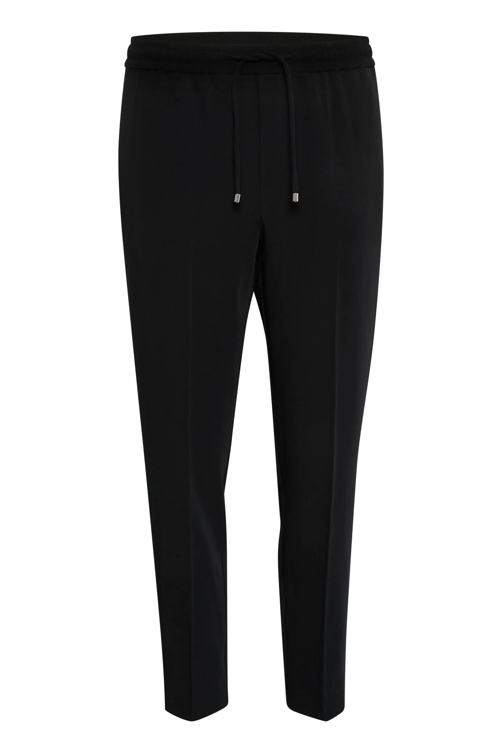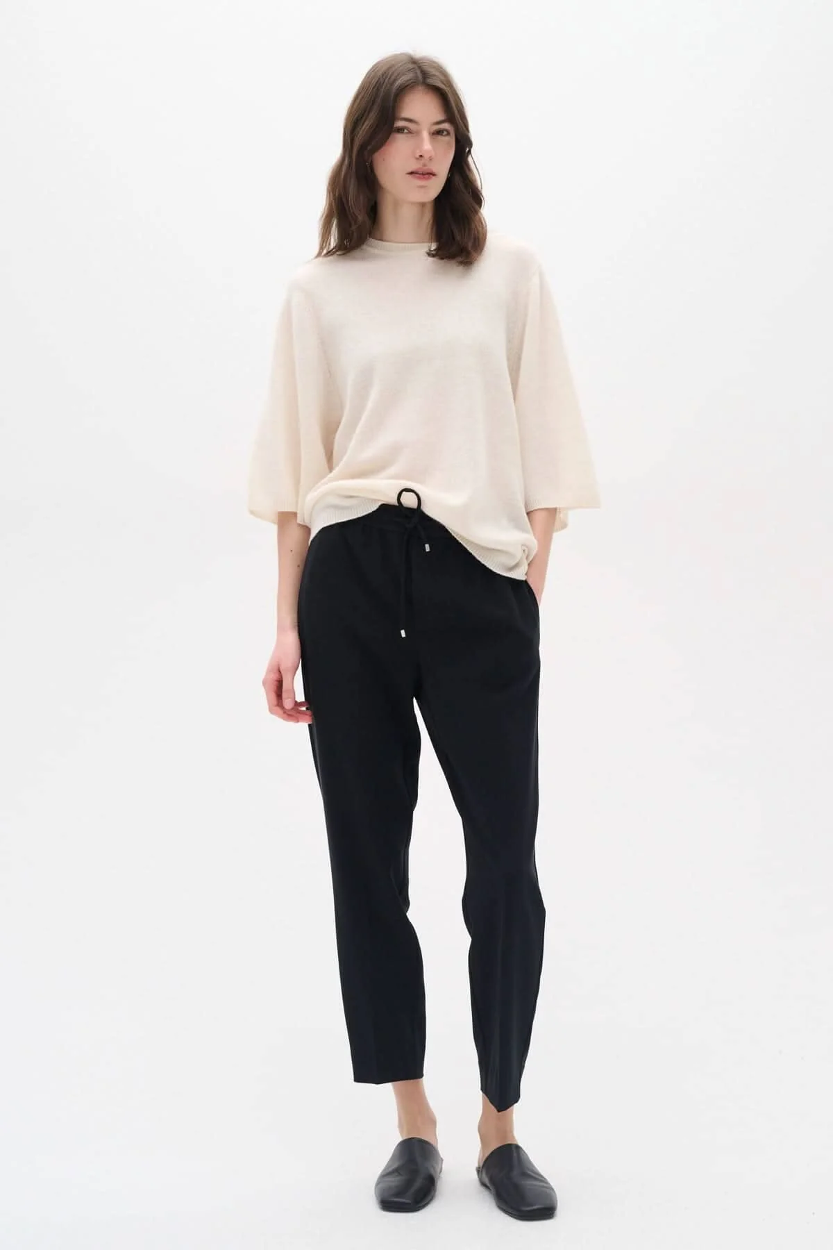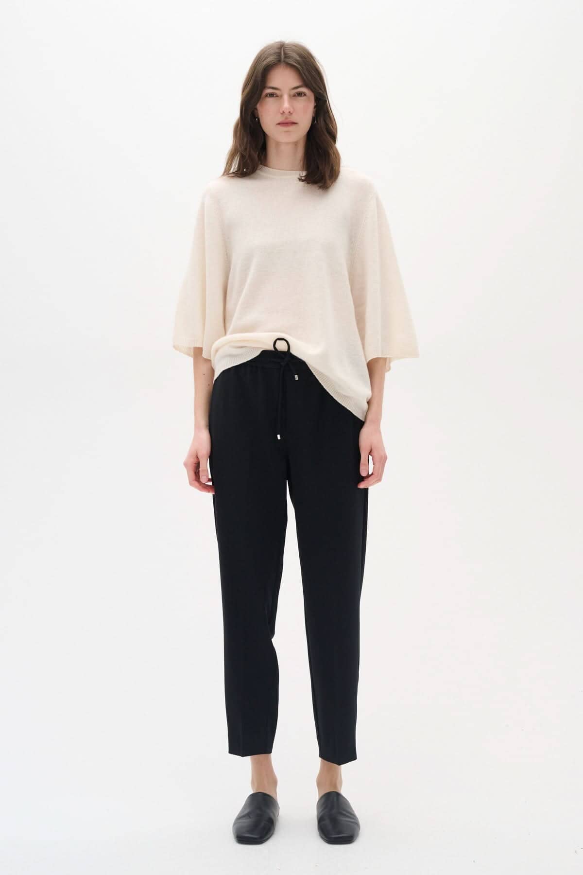 Description: Un pantalon inspiré du jogger athlétique pour un confort chic dans un tissu mince et confortable longueur cheville avec une taille élastique ajustable avec cordon coulissant, poches biais à l’avant et poches fente passepoilées cousues en trompe-l’oeil à l’arrière, coupe décontractée.