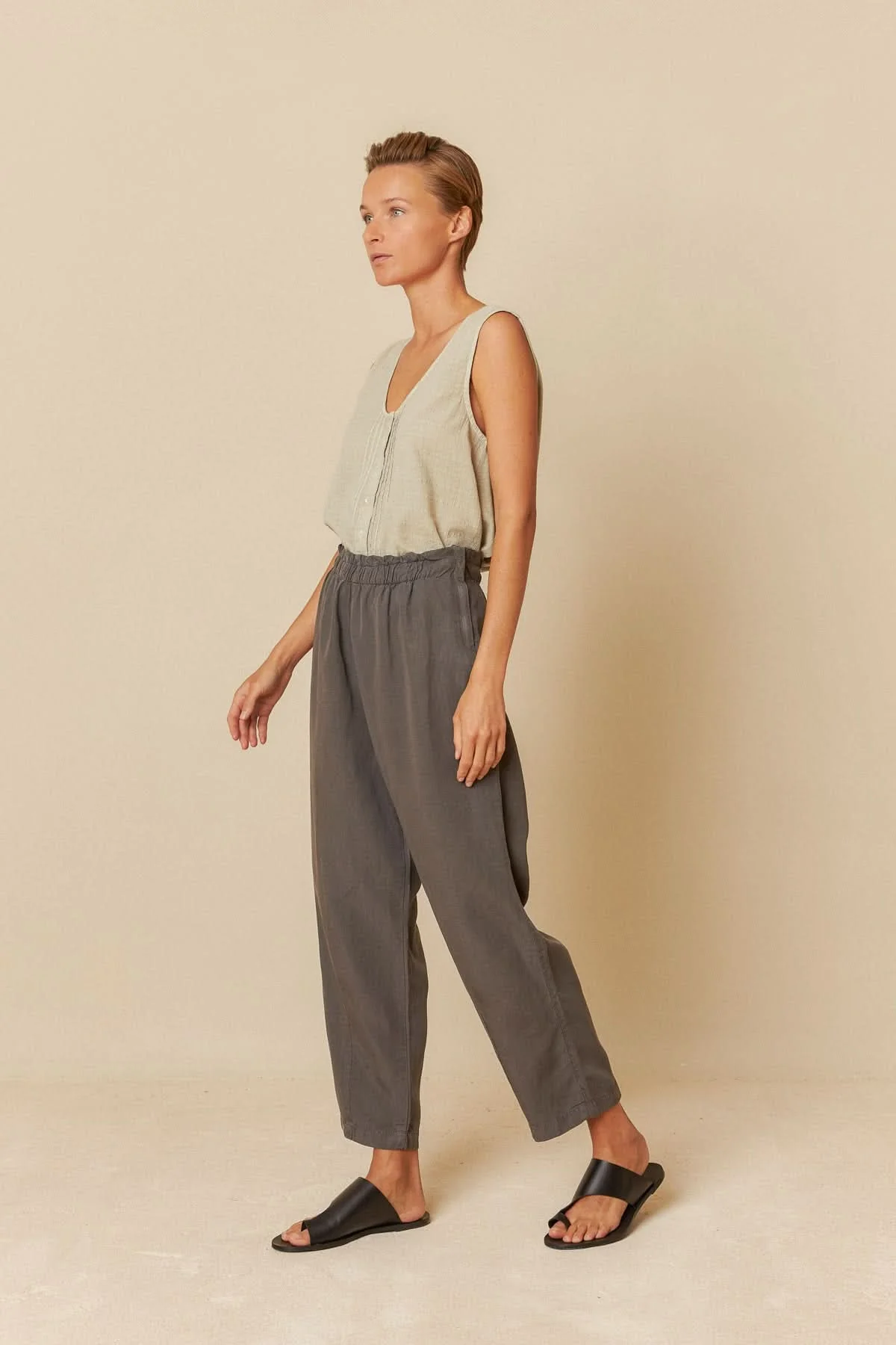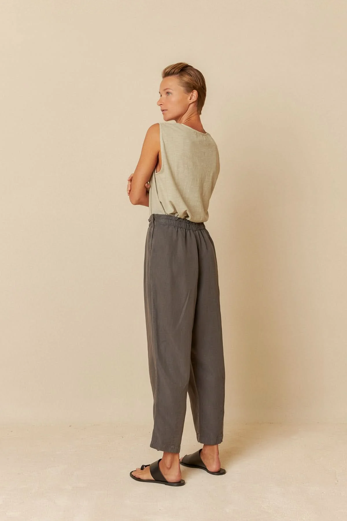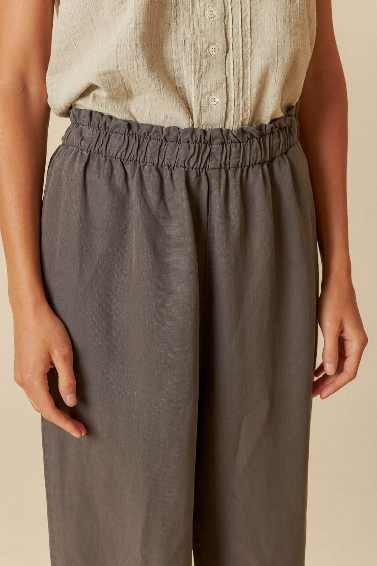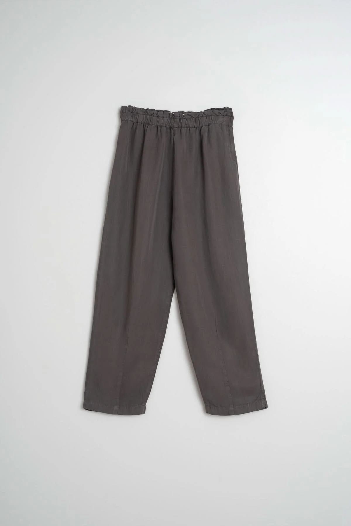 DESCRIPTION: Ce pantalon ample offre une silhouette fluide et confortable avec sa taille élastiquée et sa longueur juste au-dessus des chevilles. Sa fermeture éclair discrète sur le côté ajoute une touche pratique et élégante. Idéal avec un haut ajusté pour un look chic et décontracté.