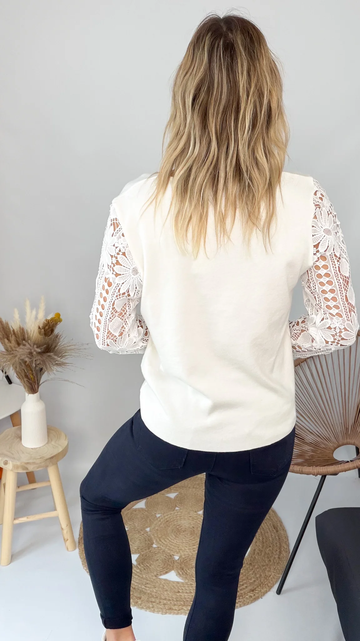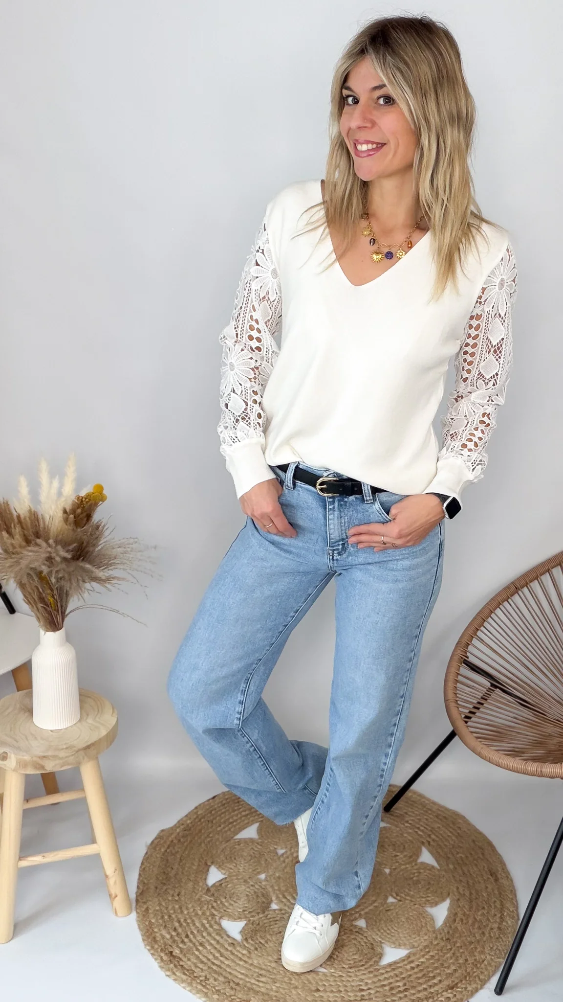 Pull Fin Écru Col V – Manches Travaillées en Dentelle Fleurie