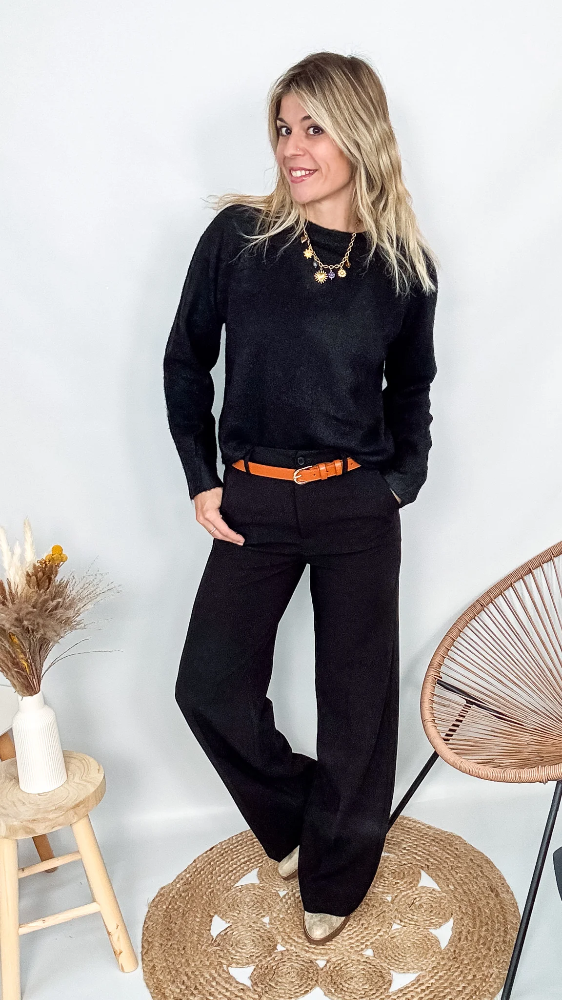 Le Look : Parfait avec une jupe léopard ou un jean taille haute (pour éviter de montrer la peau). Ajoutez un collier pour égayer le col rond classique.