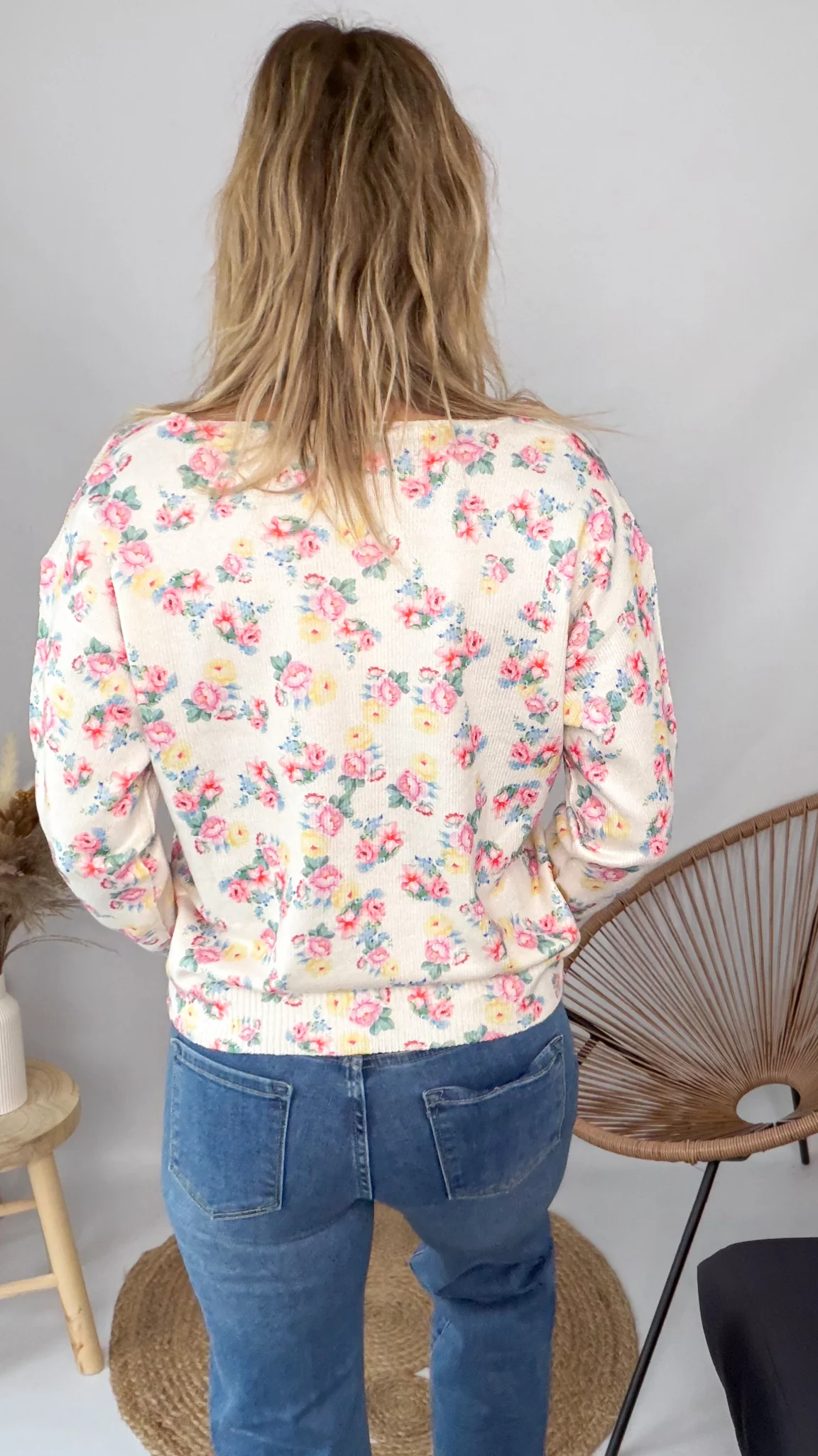 Apportez une note de fraîcheur et de romantisme à votre vestiaire avec notre pull Romance. Ce pull à la maille fine et lumineuse se distingue par son imprimé floral délicat aux tons roses, jaunes et bleus sur un fond écru élégant. Une pièce douce qui annonce les beaux jours avec style.