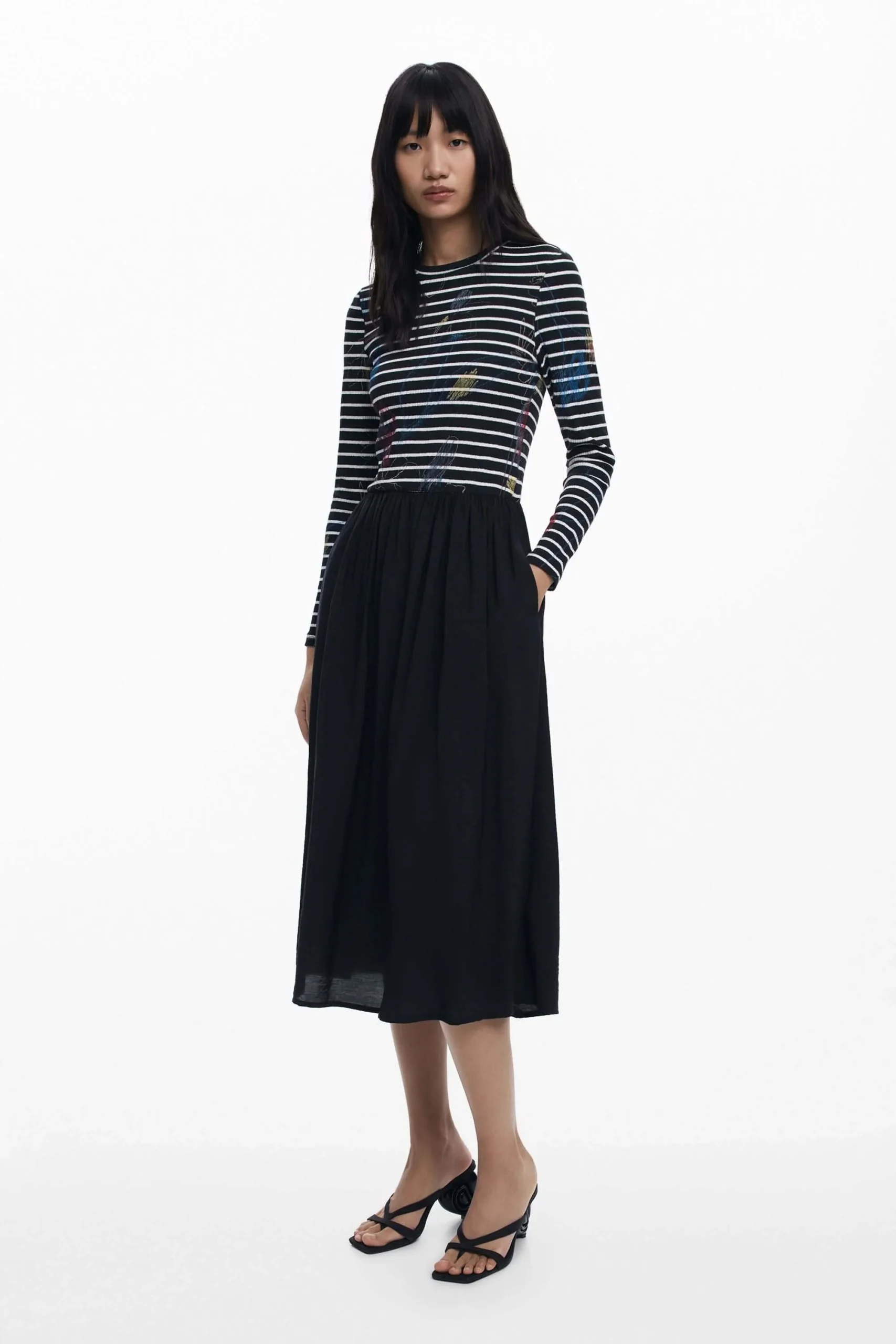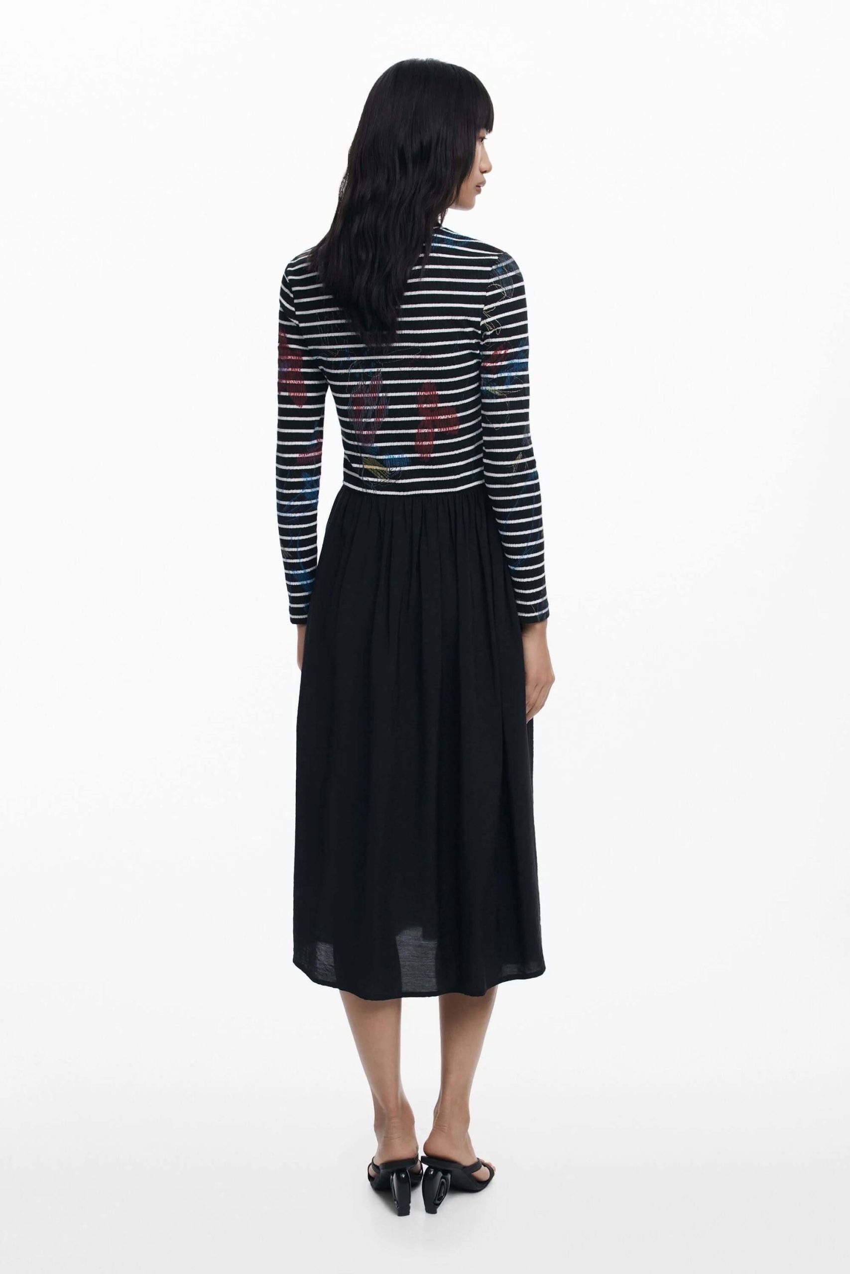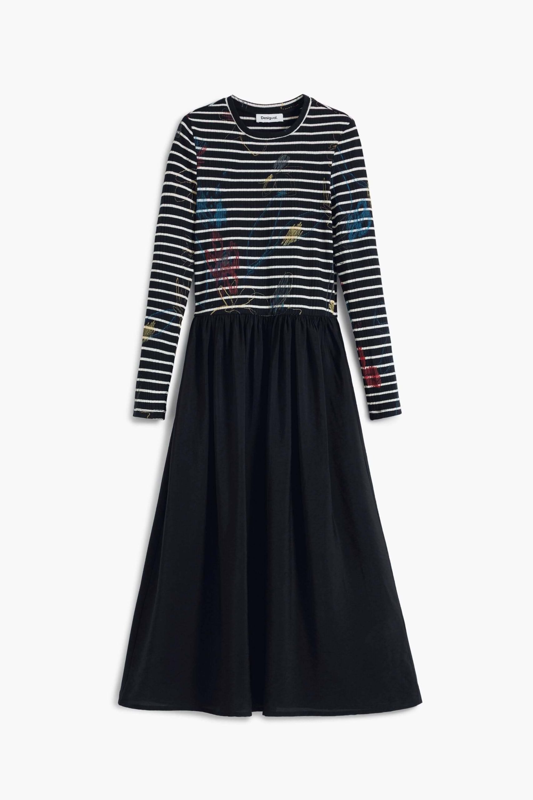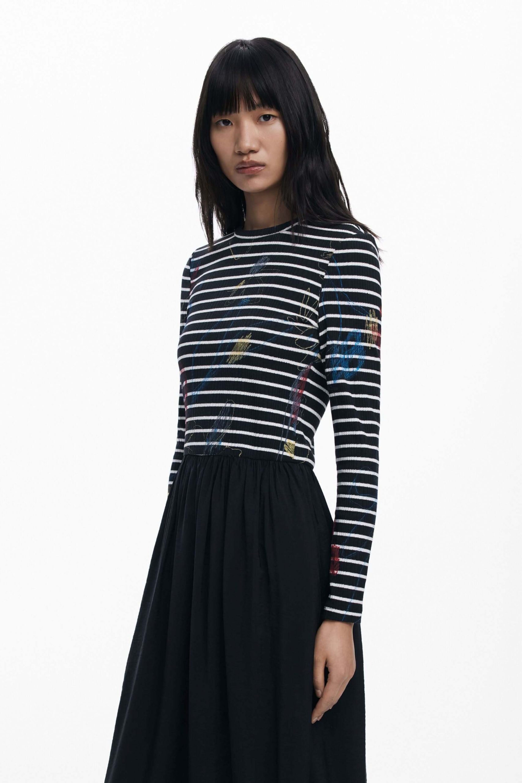 Description : Cette robe midi combine un haut à rayures imprimé d’accents graphiques et une jupe fluide unie pour un contraste élégant et moderne. Sa taille cintrée et son encolure classique mettent en valeur la silhouette tout en assurant un confort optimal. Conseil style : portez-la avec des sandales à talon ou des bottines pour un look de jour comme de soirée.