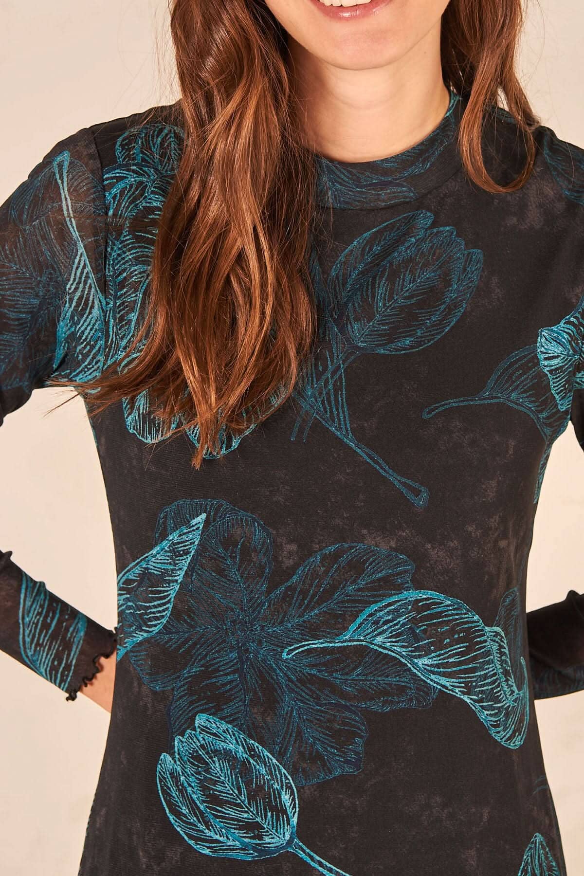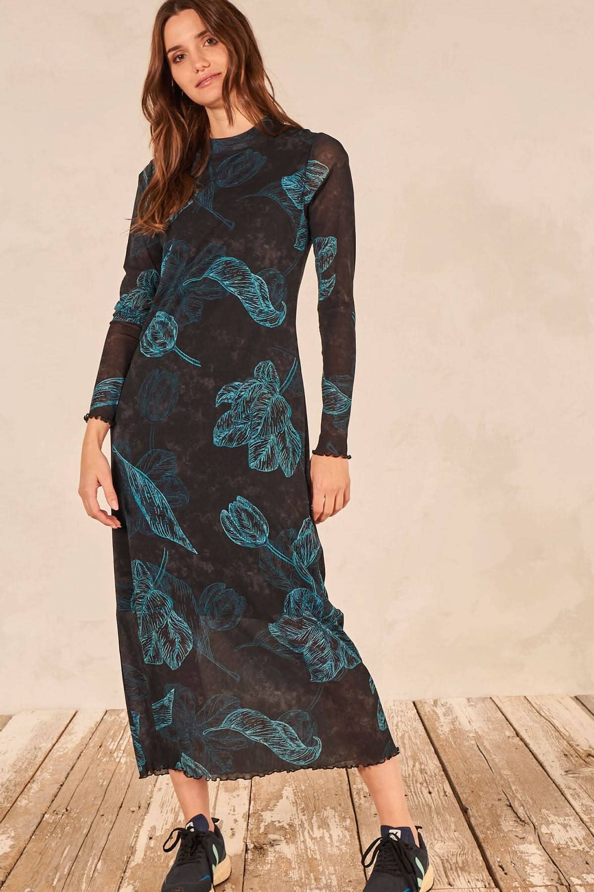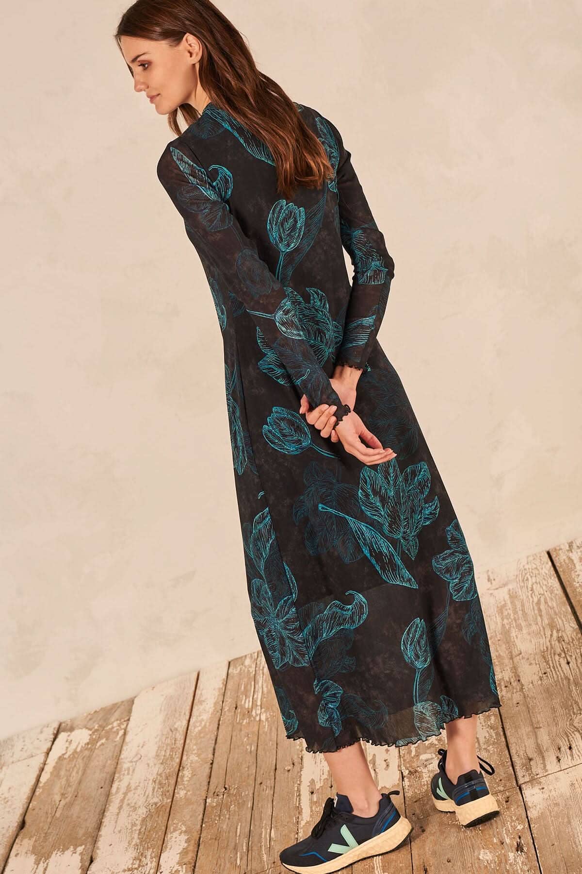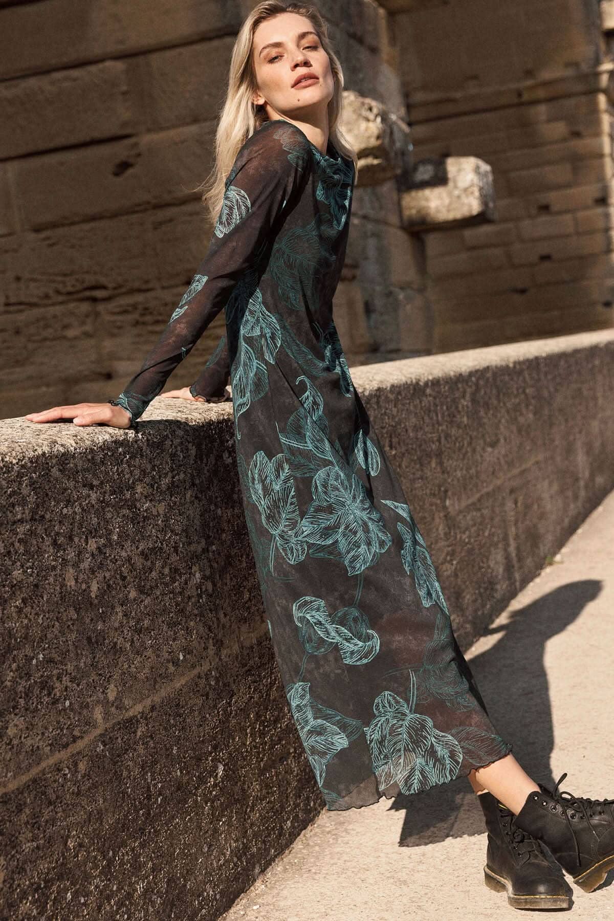 DESCRIPTION: Jolie robe longue avec une coupe près du corps. Elle comporte un légé col monté, des manches transparentes grâce a l’aspect maille fine tendance et un joli imprimé uni de feuilles. Portez-la avec des bottes pour un look décontracté.
