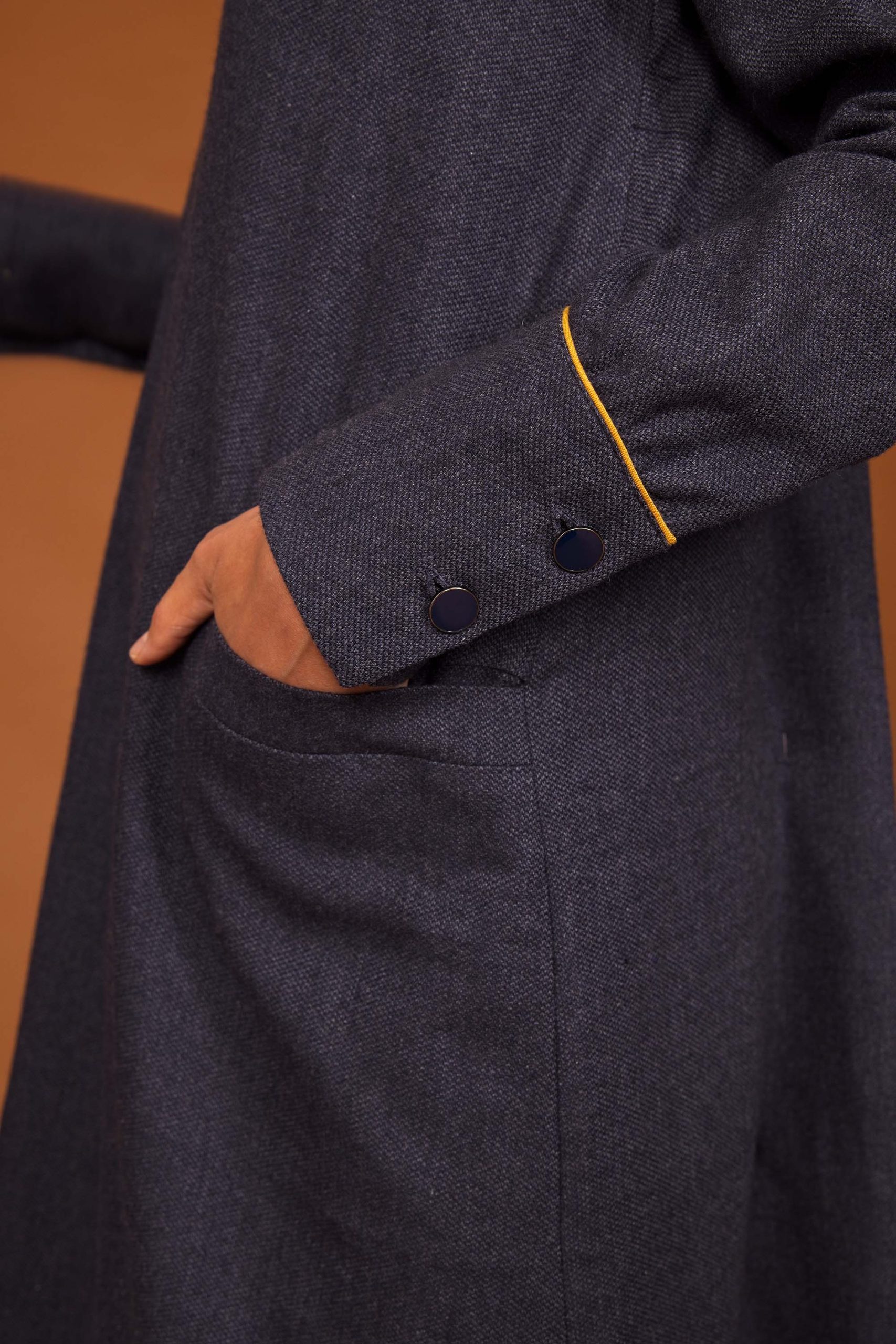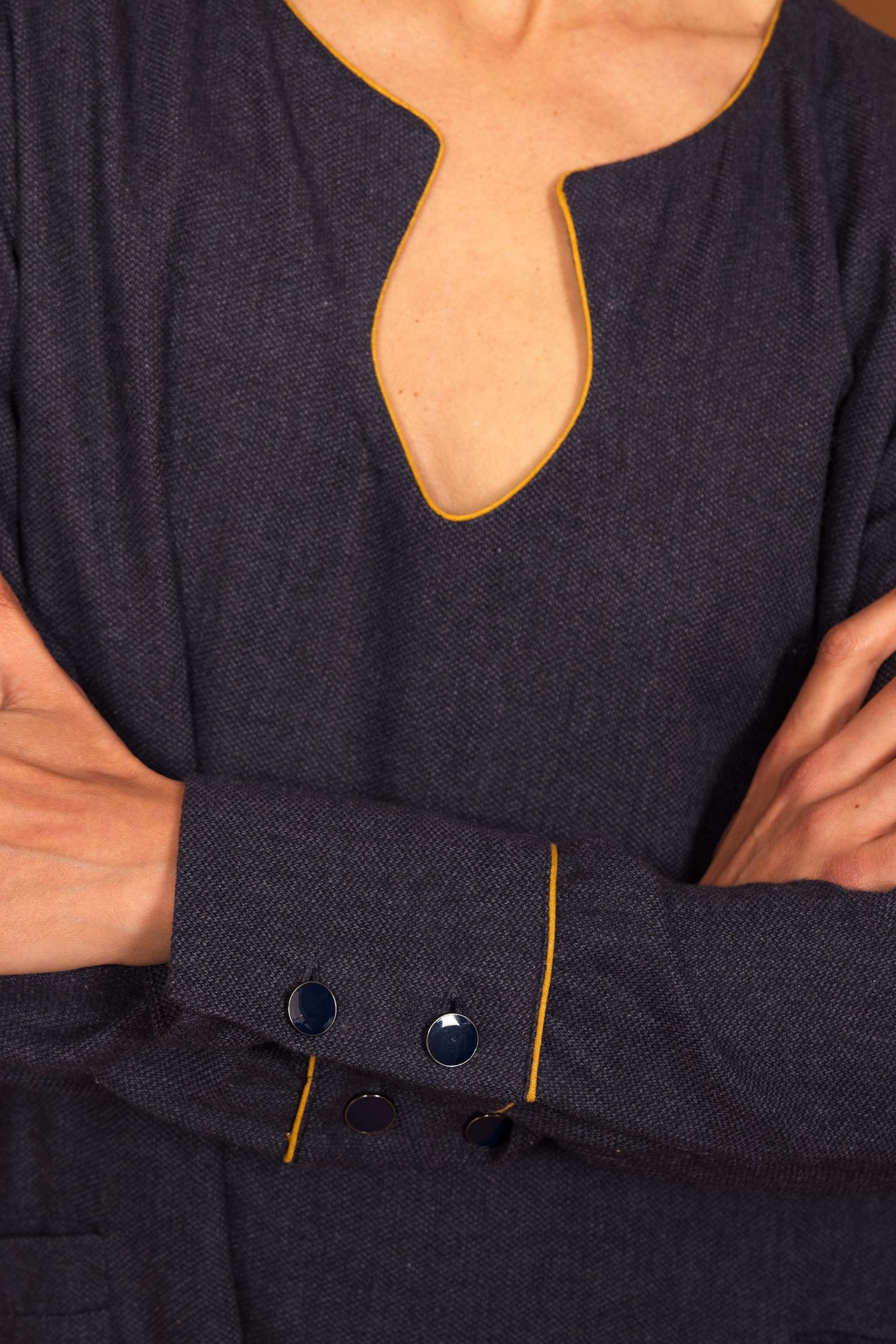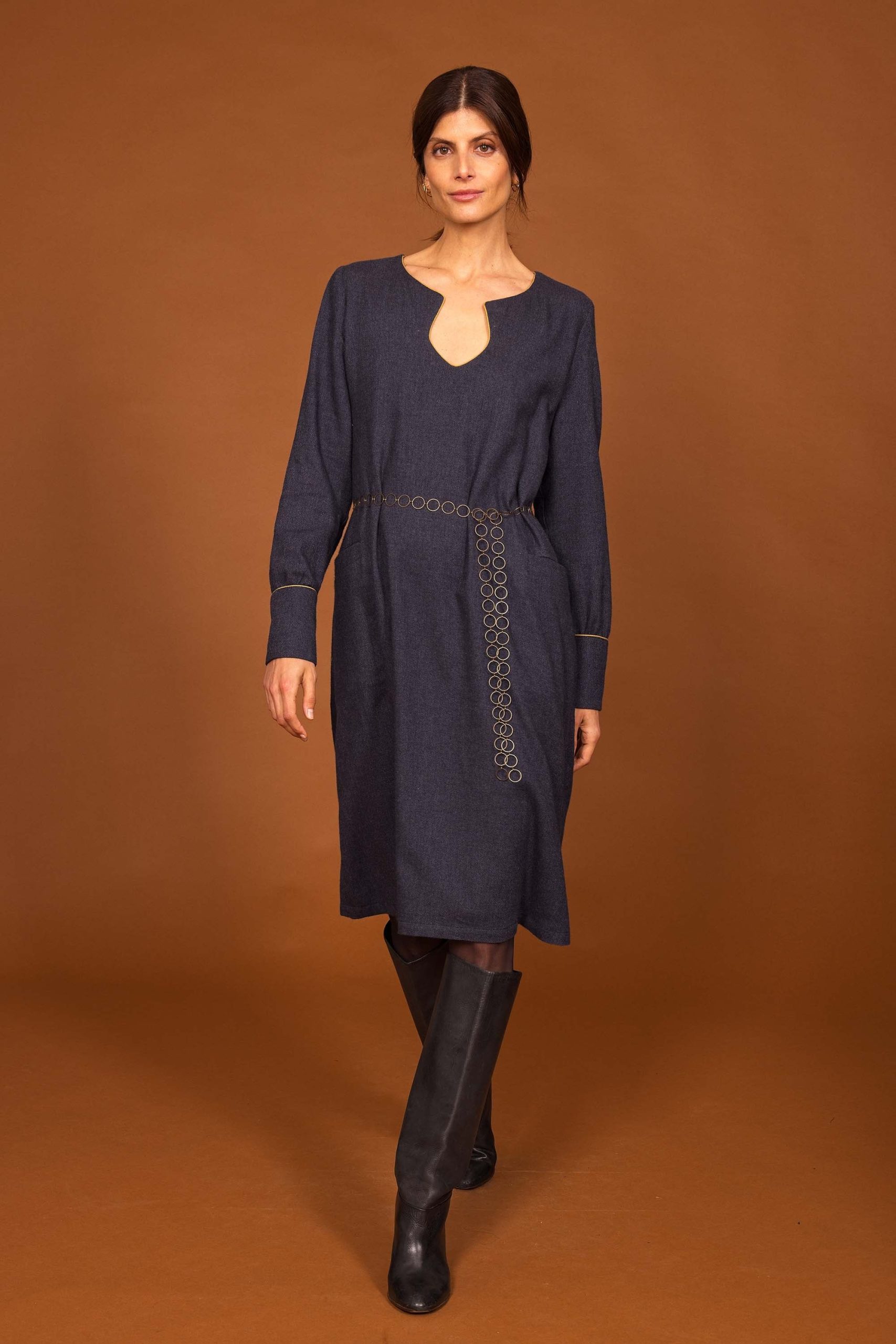 La robe MANZONI incarne l’élégance intemporelle. Col goutte délicat, poignets soulignés d’un passepoil doré, coupe fluide et chic minimaliste. Une pièce raffinée, parfaite pour une silhouette moderne. Un essentiel du vestiaire féminin signé Anne Willi.