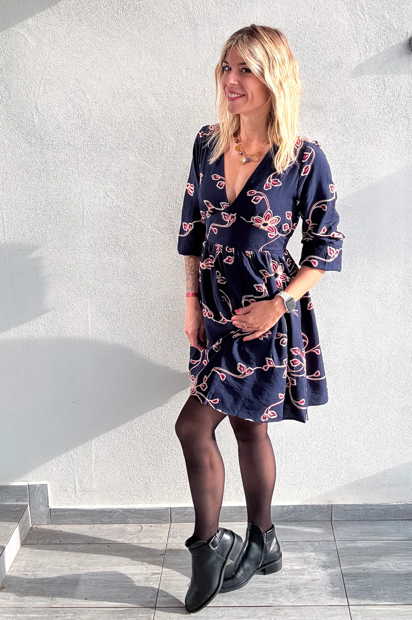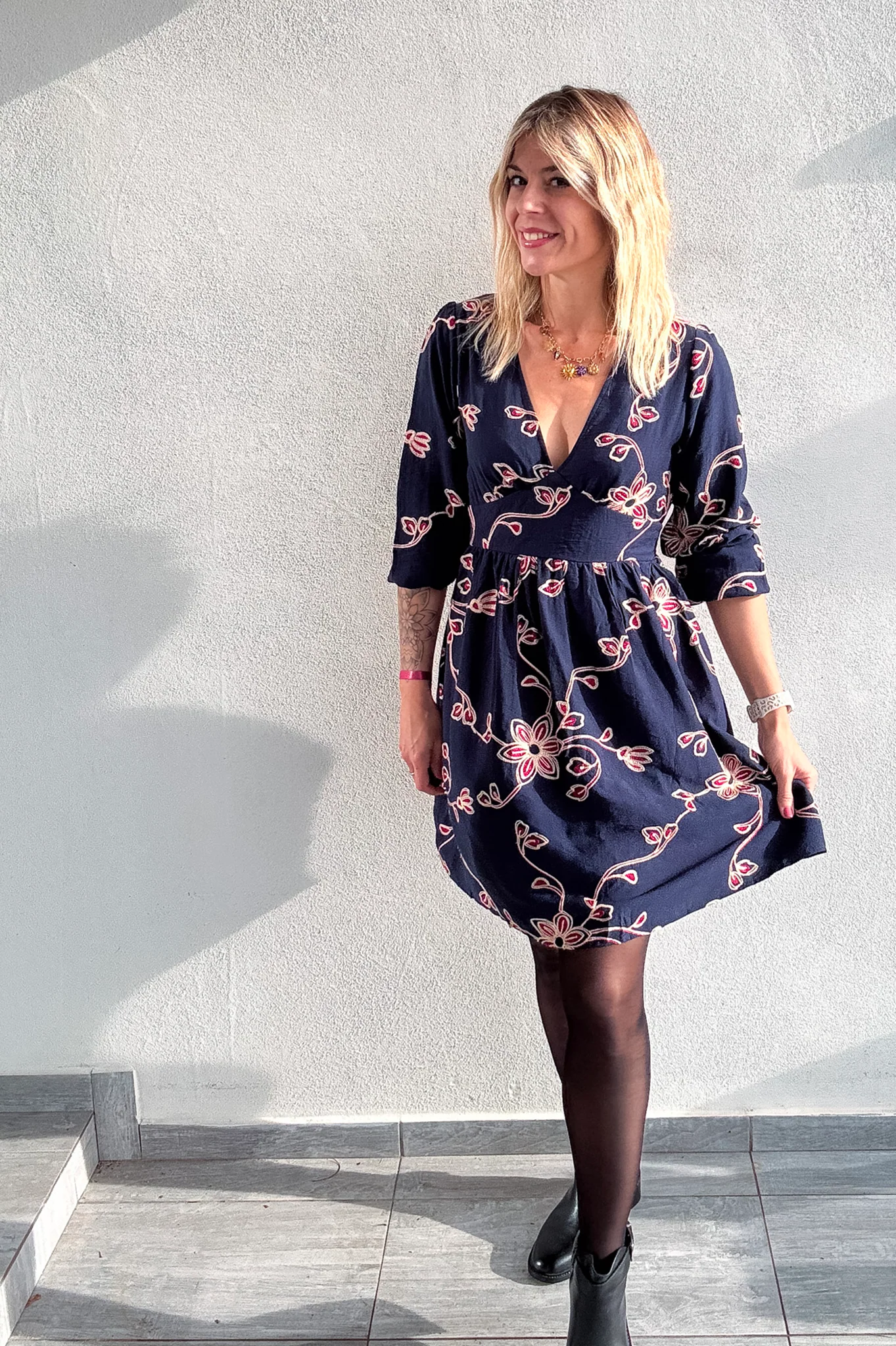 Robe manches longues marine avec broderie, décolleté plongeant en V, élastique à la taille. Elastique au bout des manches.