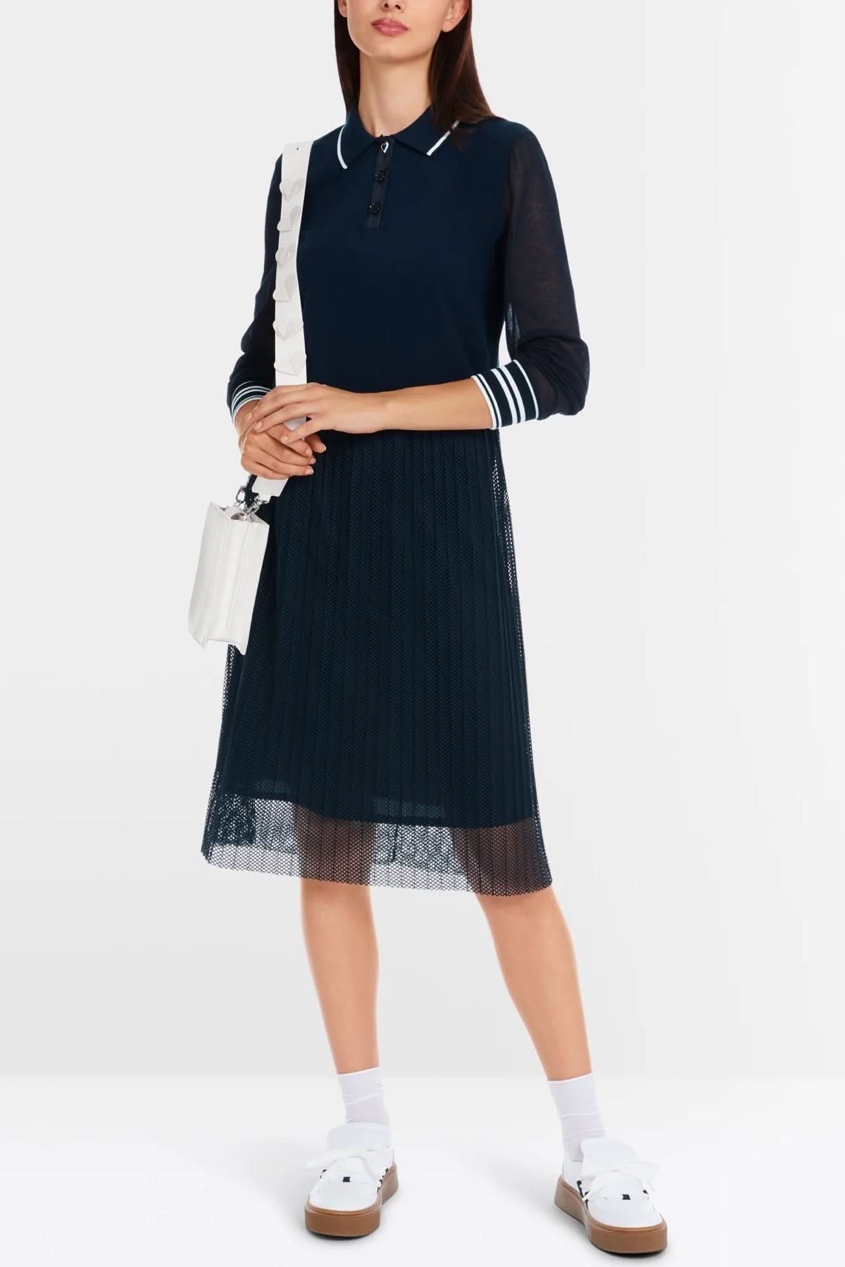 Description : Robe midi dans un mélange de matières sophistiqué. Le haut est transparent au niveau des manches et opaque sur le devant et dans le dos. La jupe est en résille plissée transparente. Cool, les détails à rayures dans le col et les poignets. Le modèle est Knitted in Germany. Il est tricoté et ennobli en Allemagne à l’aide des technologies les plus modernes. Les différentes pièces – comme le dos, le devant, etc. – sont cousues ensemble dans des entreprises partenaires européennes.