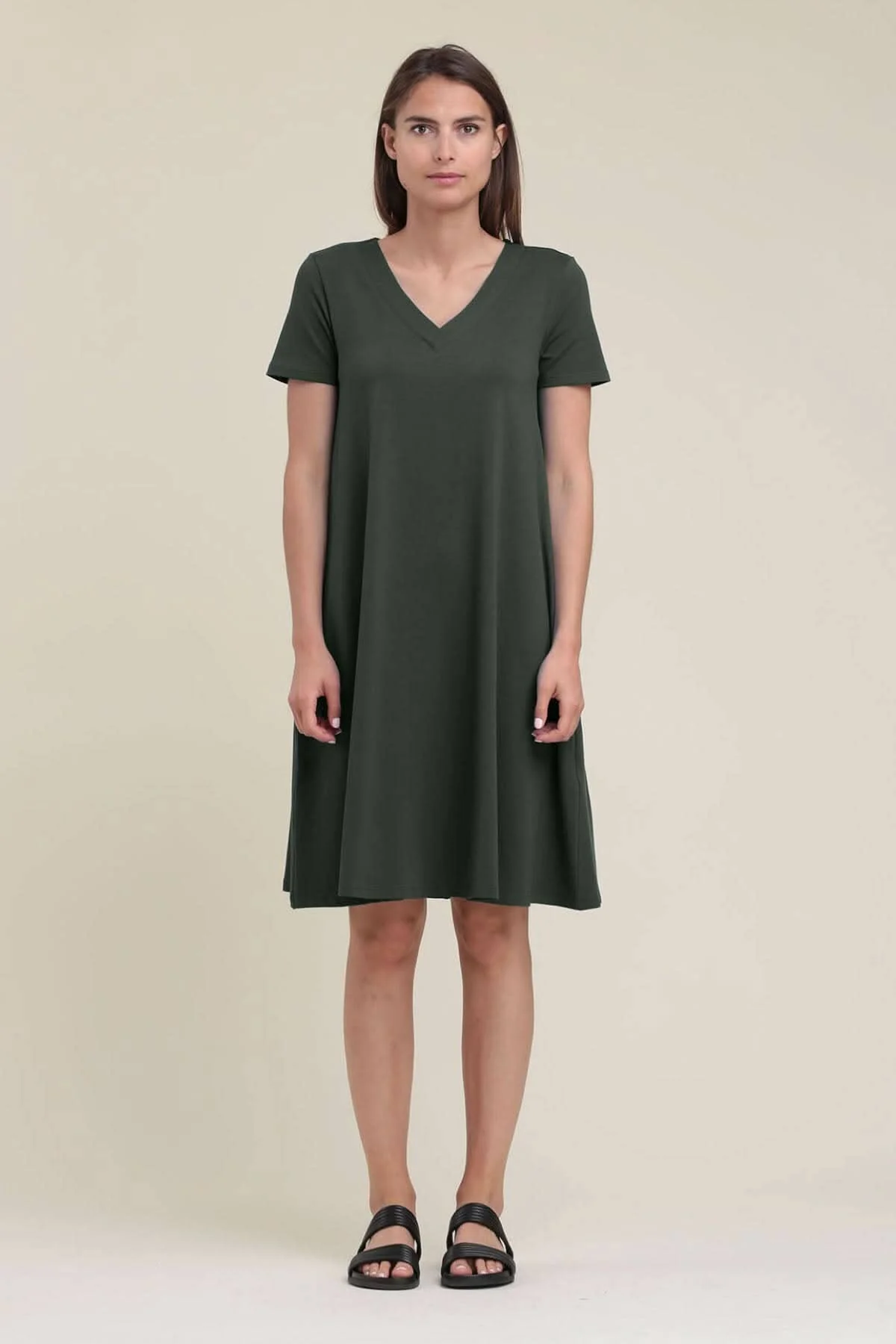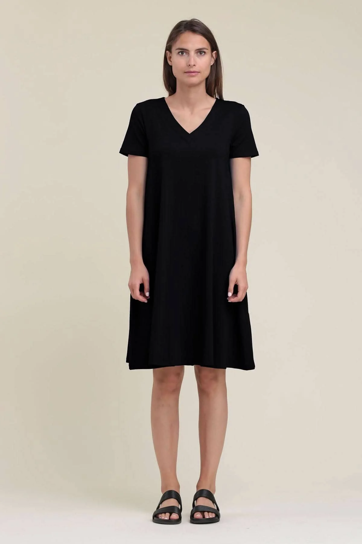 DESCRIPTION: Cette robe ample est dotée de manches courtes, d’une encolure en V et arrive jusqu’aux genoux. Portez-la avec une ceinture pour mettre en valeur votre taille.