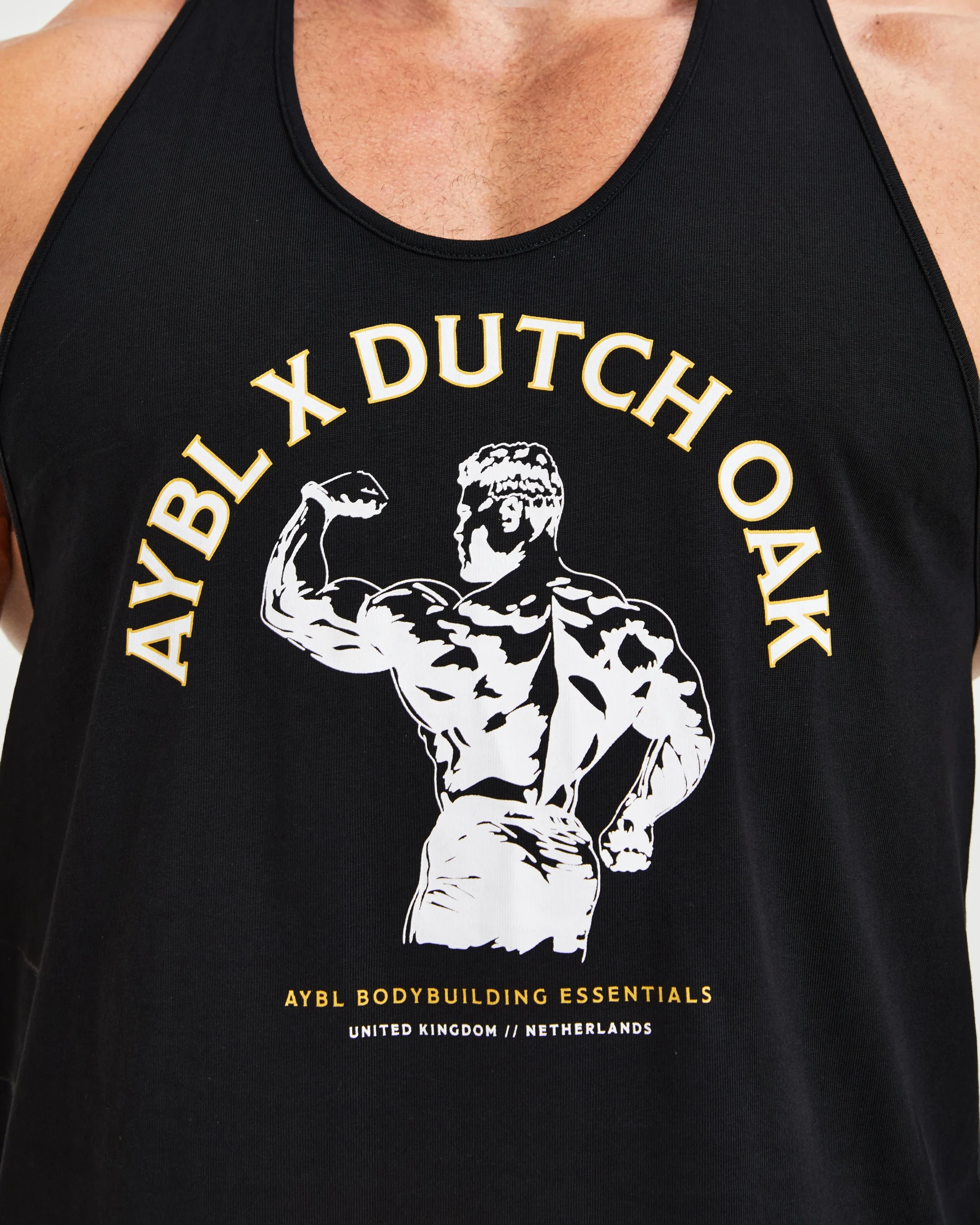 Modernisez votre garde-robe de sport avec le stringer Wesley Vissers X Dutch Oak. Il arbore un imprimé graphique sur le devant, inspiré du légendaire culturiste Wesley Vissers. Confectionné dans un tissu en coton doux, il présente des emmanchures tombantes et une coupe stringer qui met en valeur vos muscles.